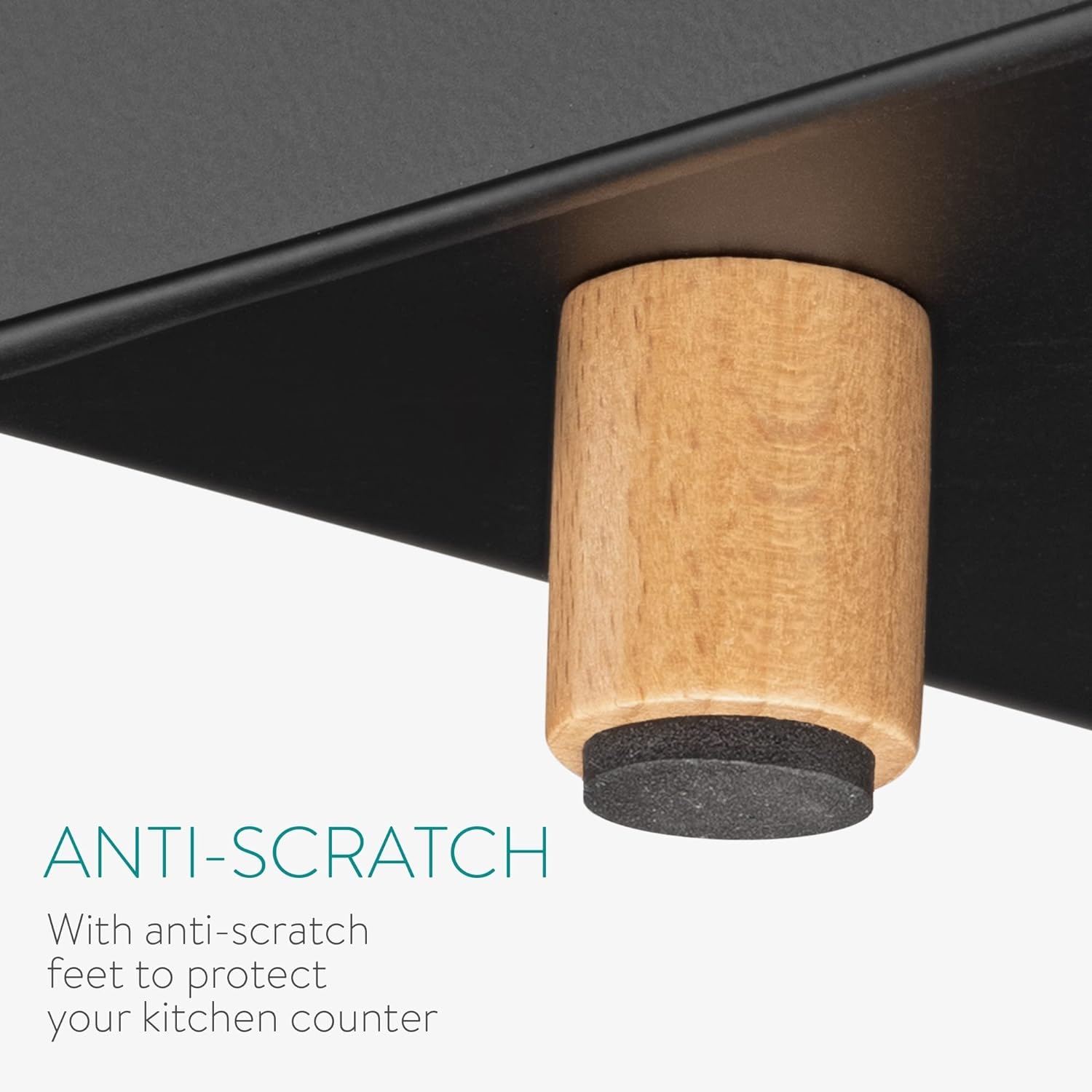 Στο κάτω μέρος της ψωμιέρας, υπάρχουν αντιολισθητικά πόδια, που προστατεύουν τον πάγκο της κουζίνας ή την επιφάνεια εργασίας σας από γρατζουνιές, αλλά βοηθούν επίσης στη διατήρηση της καλής κατάστασης των ποδιών, λειτουργώντας ως φράγμα μεταξύ των ποδιών και του πάγκου. Η λαβή και τα πόδια από ξύλο οξιάς προσθέτουν την τελευταία πινελιά σε αυτό το κομψά σχεδιασμένο κουτί ψωμιού!