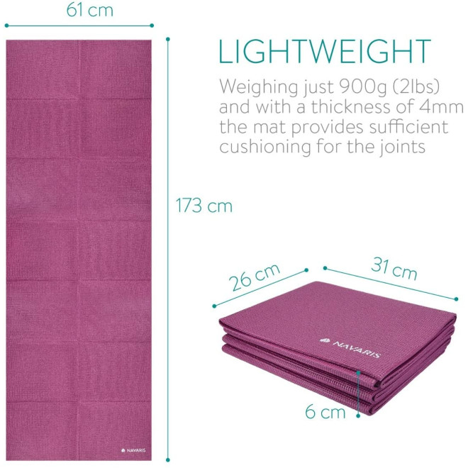Το στρώμα γιόγκα Navaris είναι αναδιπλούμενο, ώστε να μπορείτε να το πάρετε εύκολα όταν ταξιδεύετε ή ακόμα κι αν θέλετε να κάνετε τις συνεδρίες γιόγκα σε εξωτερικούς χώρους, όπως στο πάρκο ή στην παραλία.