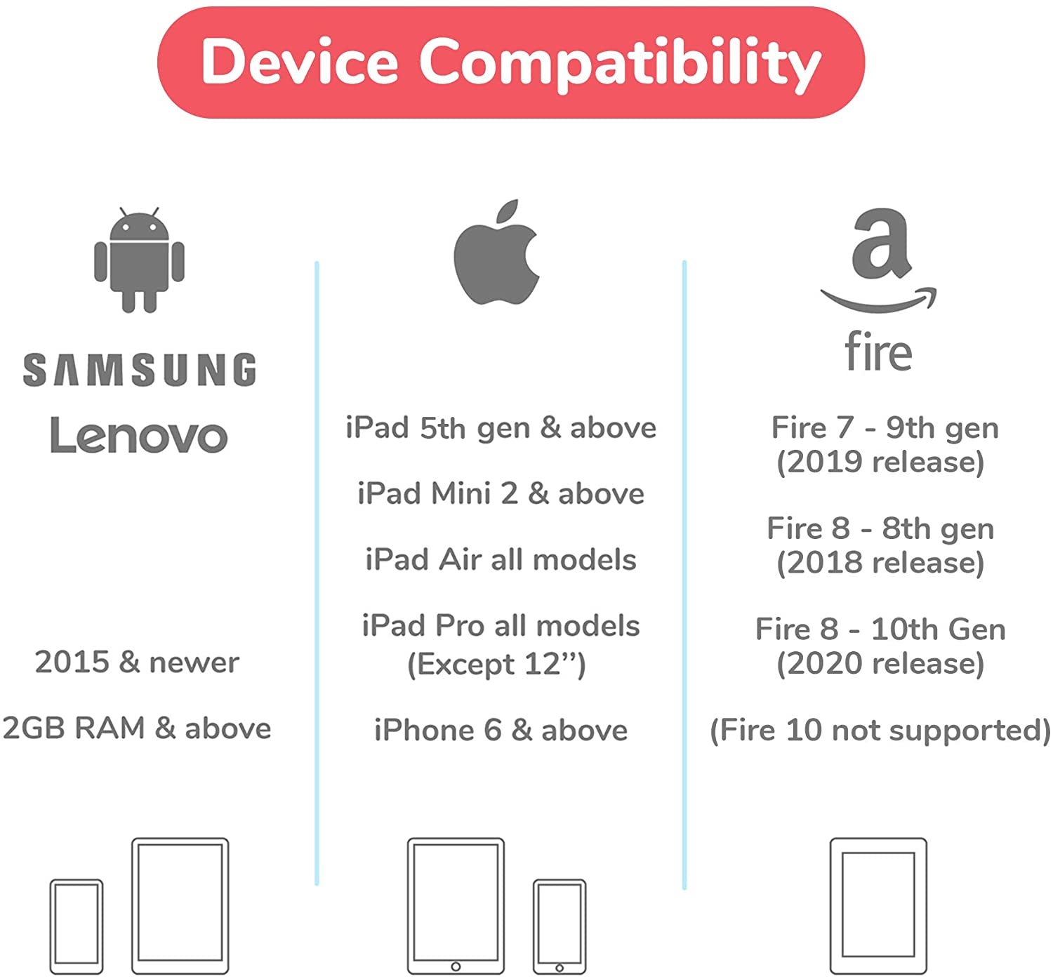 Συμβατό με: iOS & Android συσκευές. Από iPad 5ης γενιάς ή νεότερα, iPad 3rd γενιάς και νεότερα, όλα τα μοντέλα iPad Air και iPad Pro (εκτός από το iPad Pro 12″), iPad Mini 2 ή νεότερα, iPhone 6 ή νεότερα, Android συσκευές με 2GB RAM και άνω, Amazon Fire 7 ή νεότερο.
