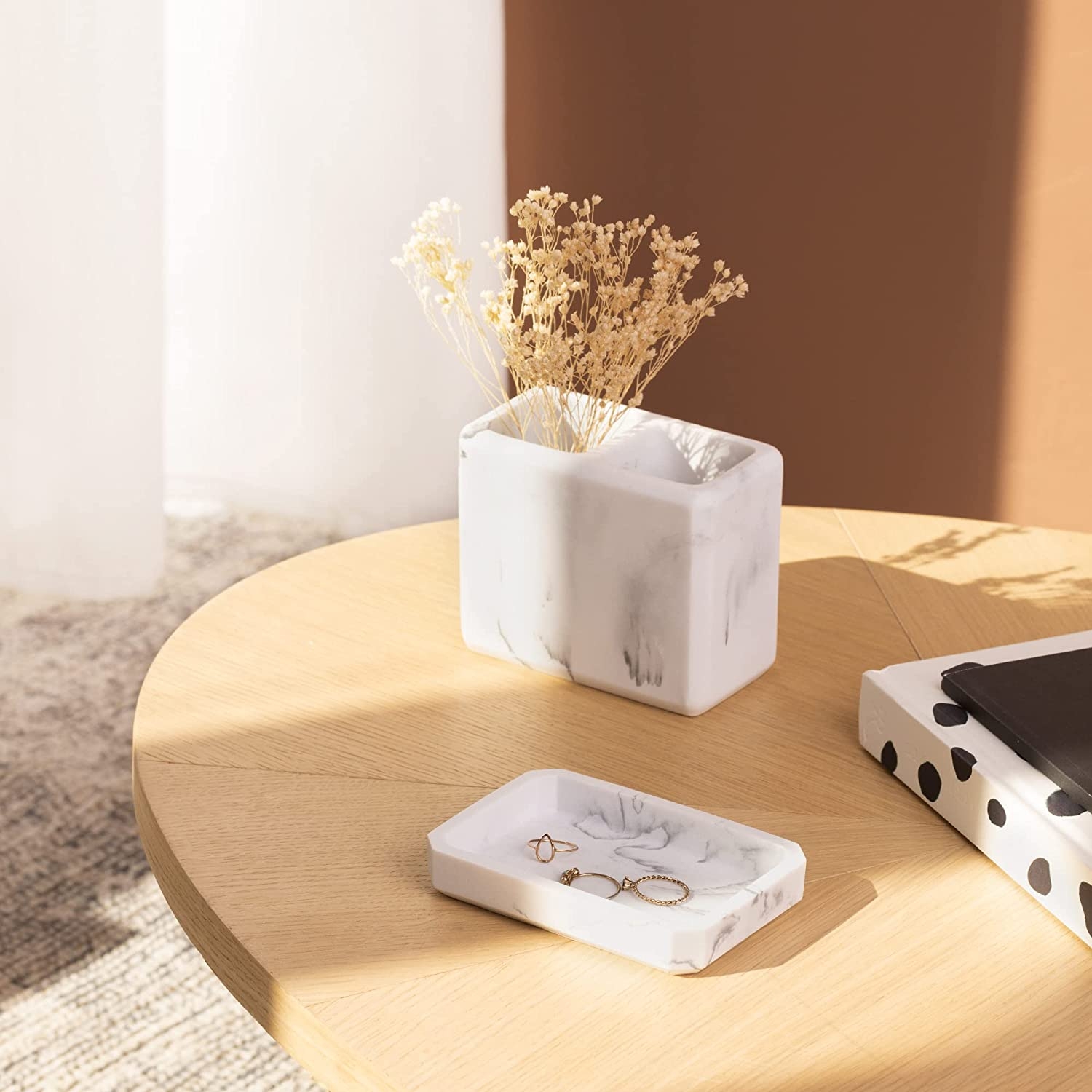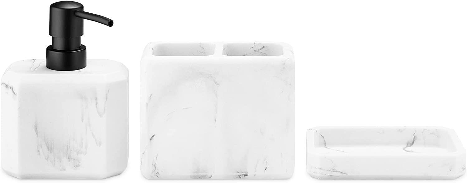 Το διακοσμητικό σετ μπάνιου της Navaris, θα χαρίσει στο μπάνιο σας κομψότητα και στυλ. Το μοναδικό σετ σε σχέδιο μαρμάρου μπορεί να χρησιμοποιηθεί είτε σαν σετ των τριών είτε το καθένα ξεχωριστά. Θα διαμορφώσετε το μπάνιο σας εύκολα και χωρίς πολύ κόπο.