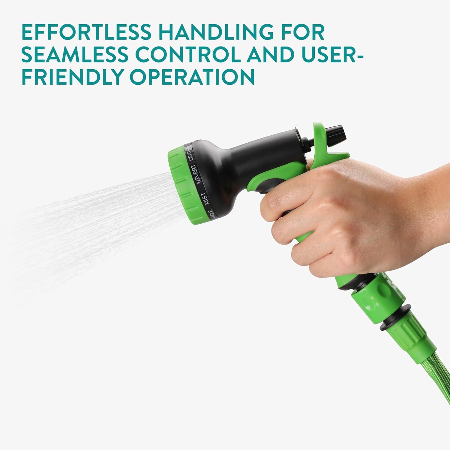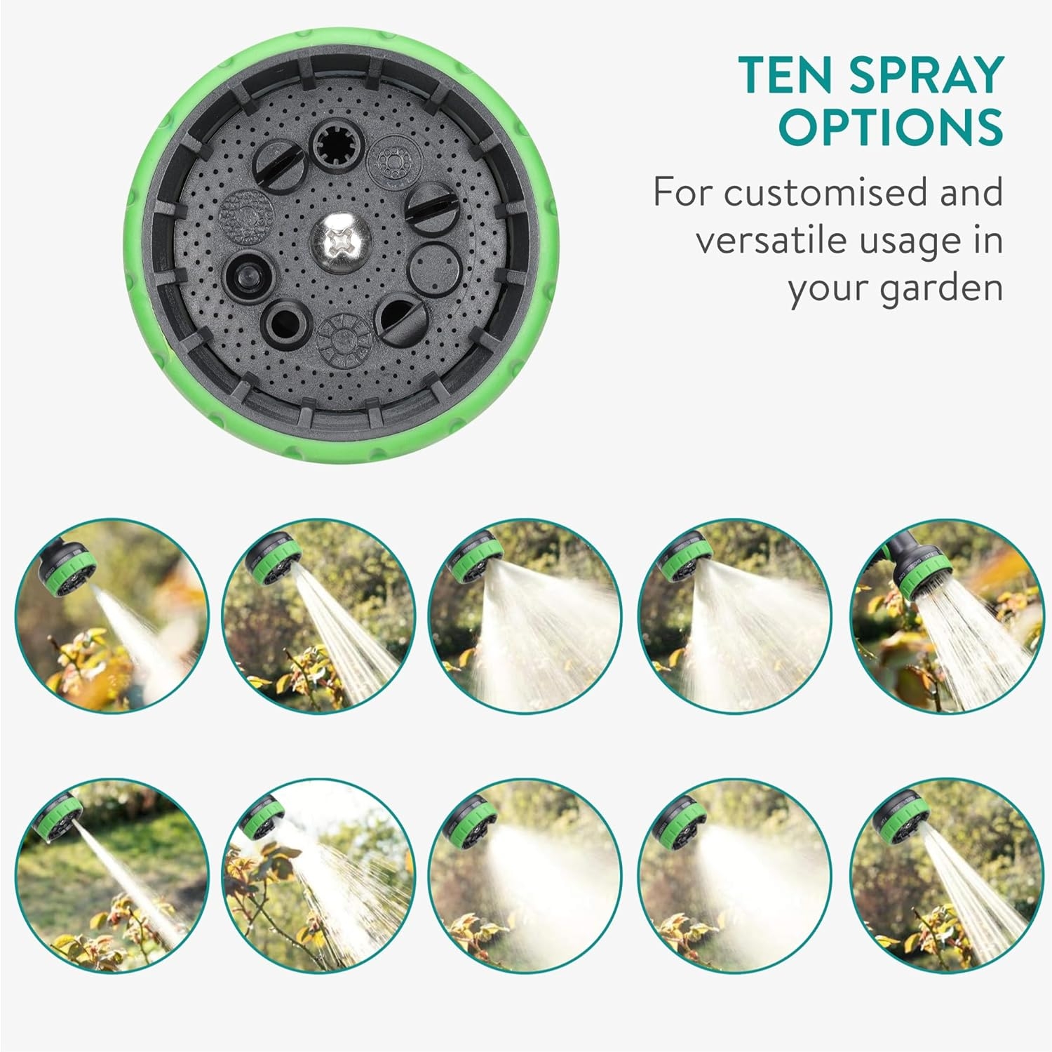 Είναι εξοπλισμένο με ένα εύχρηστο ντους νερού, το οποίο έχει συνολικά 10 διαφορετικά σχέδια ψεκασμού. Το λάστιχο είναι εύχρηστο και θα σας διευκολύνει στο πότισμα ή πλύσιμο καθώς δεν τσακίζεται, στρίβει ή μπλέκεται. Ταυτόχρονα σας προσφέρει εύκολη και γρήγορη σύνδεση στην βρύση σας.