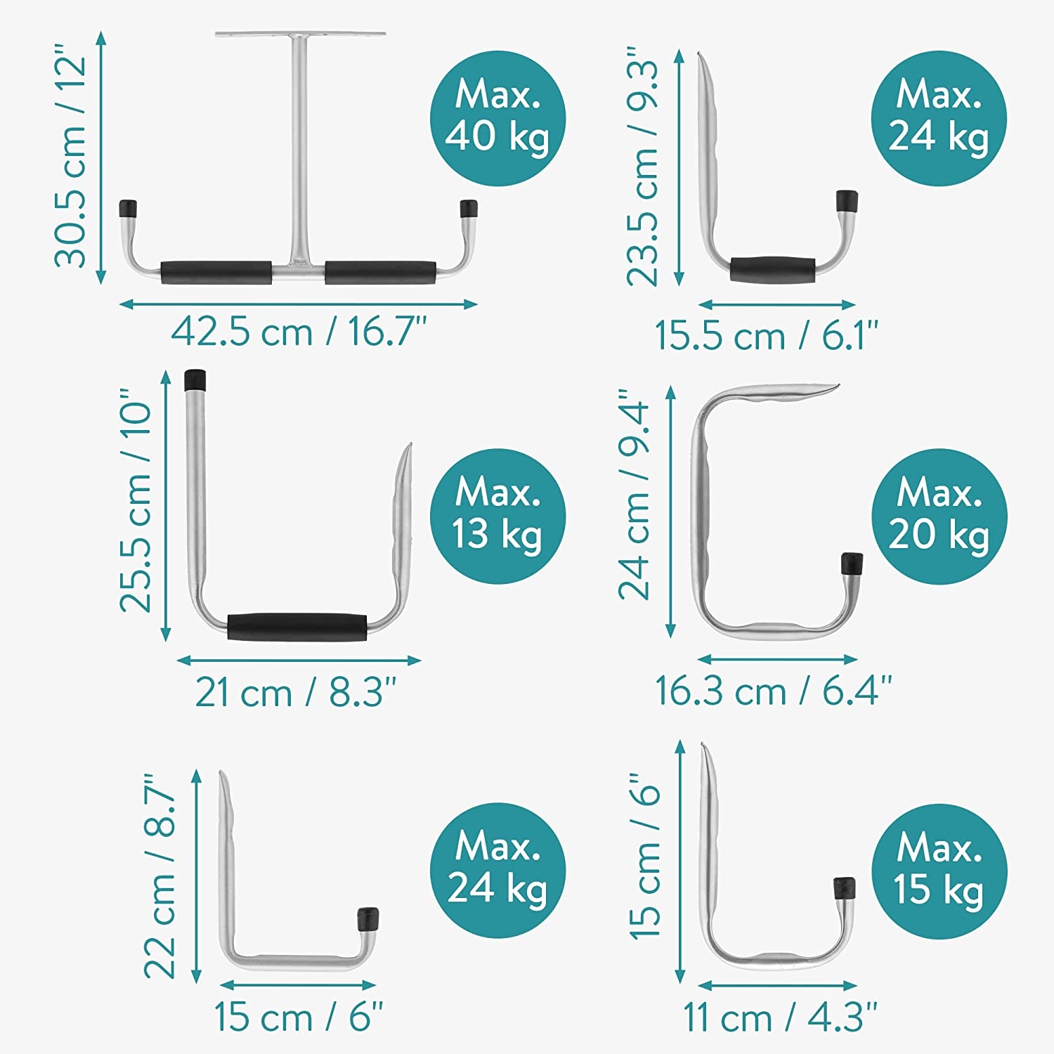Μπορούν να τοποθετηθούν είτε σε οροφή είτε σε τοίχο, απλώς επιλέξετε γάντζους με την κατάλληλη χωρητικότητα βάρους για τη σωστή και ασφαλή χρήση. Περιλαμβάνονται 12 τεμάχια σε 6 διαφορετικά μεγέθη και με φορτίο βάρους από 13 κιλά έως 40 κιλά.