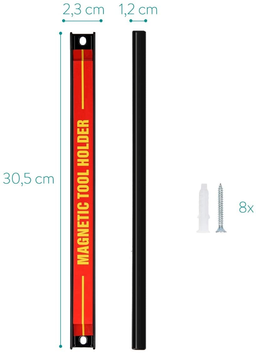 Η μπάρα εργαλείων είναι κατασκευασμένη από ανθεκτικό χάλυβα άνθρακα και η μαγνητική ταινία είναι κατασκευασμένη από σιδηρομαγνητικό κεραμικό, ένα υλικό με τις ίδιες ιδιότητες ενός μαγνήτη, αλλά με μικρότερο βάρος! Εκτός από τις 4 λωρίδες, θα λάβετε υλικό στερέωσης. Φυσικά, μπορεί επίσης να χρησιμοποιηθεί για εργαλεία κήπου όπως ψαλίδι ή σπάτουλα στον κήπο.