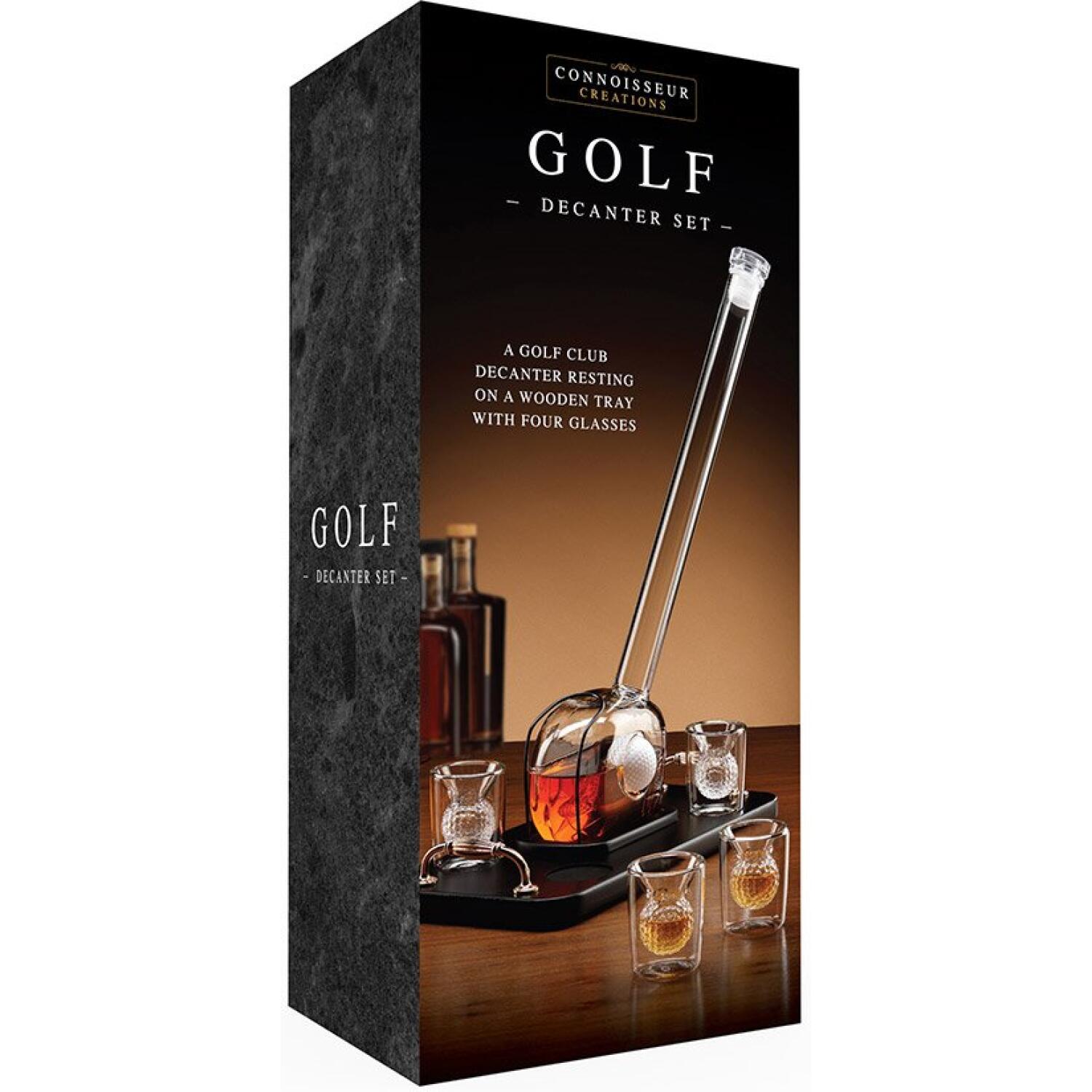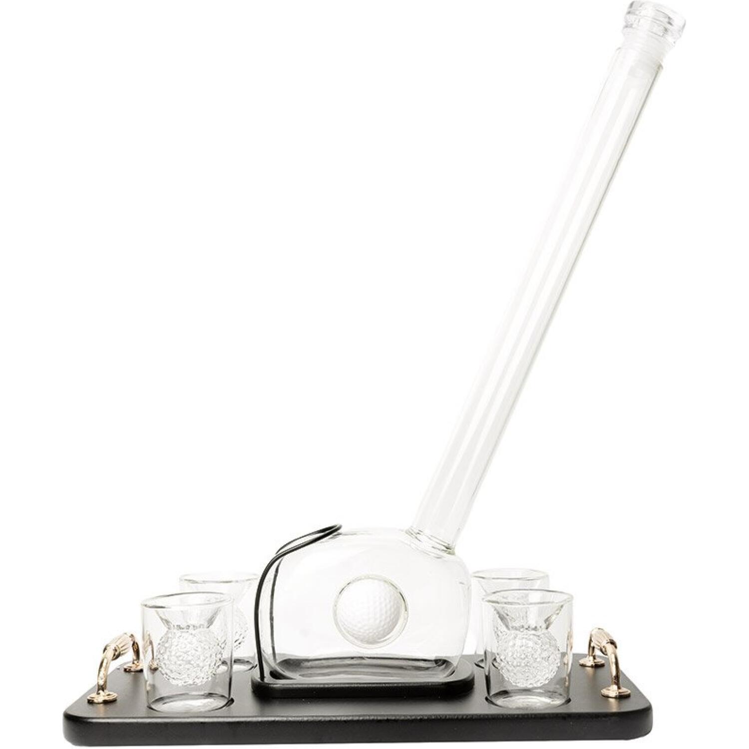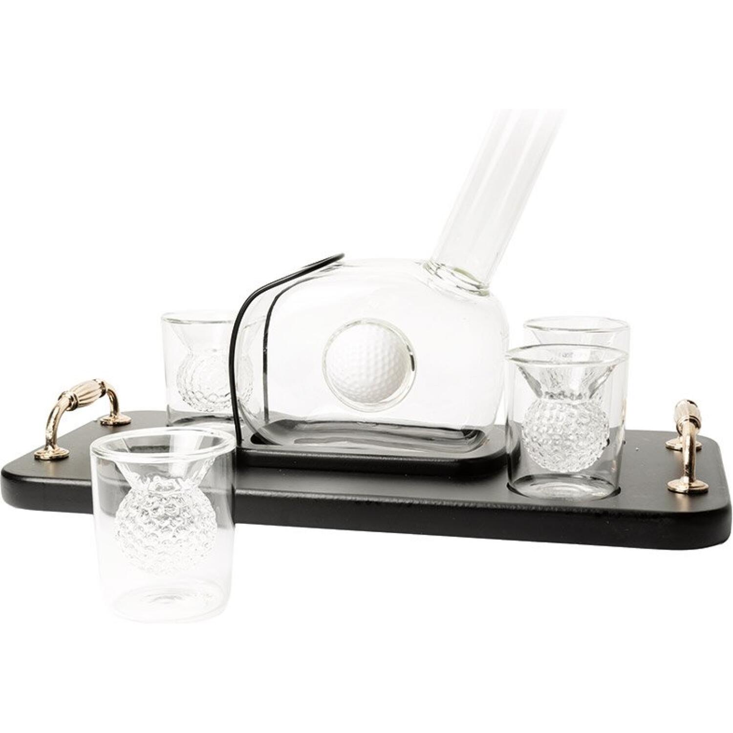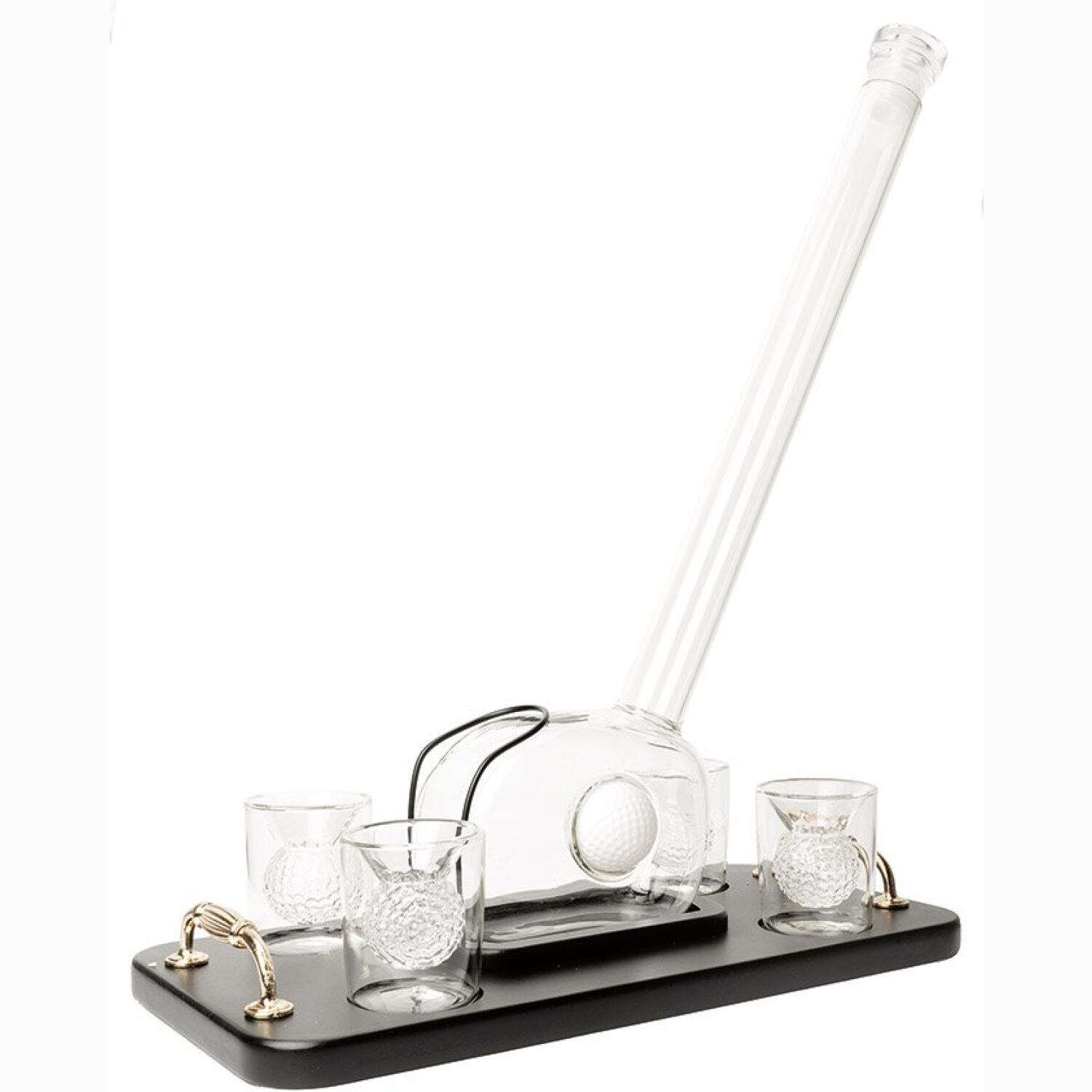 Παρέχοντας όχι μόνο μια καράφα με πώμα που θυμίζει golf club, αλλά και τέσσερα ποτήρια σε σχήμα μπάλας γκολφ, και μία ξύλινη βάση για να ακουμπάει η καράφα και τα ποτήρια, με ασφάλεια. Με χωρητικότητα που φτάνει τα 750 ml και ποτήρια 45 ml το κάθε ένα, και κατασκευή από κρυστάλλινο γυαλί με τις περίτεχνες γυάλινες λεπτομέρειες, θα διατηρήσει το αγαπημένο σας ποτό αναλλοίωτο.