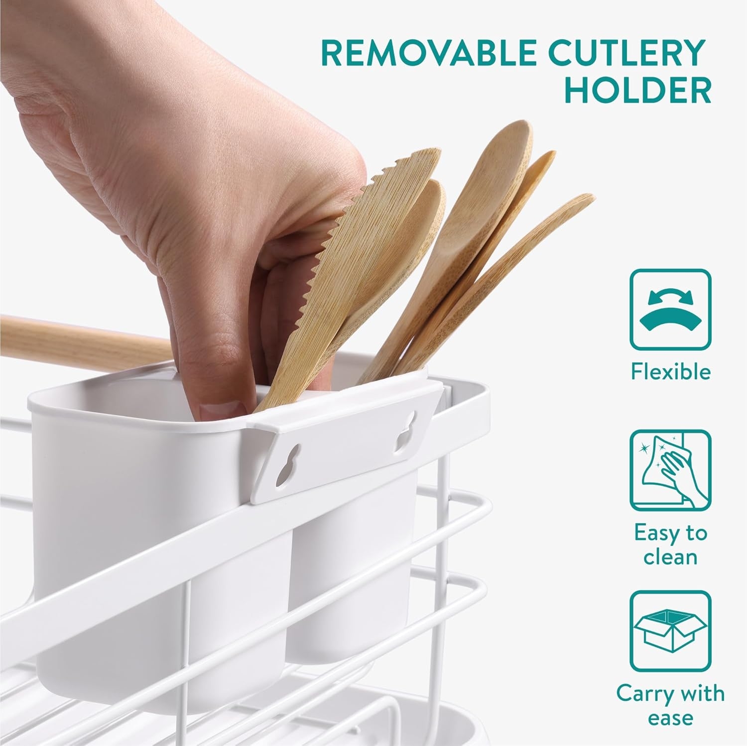 Η πιατοθήκη έρχεται με αφαιρούμενο πλαστικό δίσκο για την αποστράγγιση του νερού και μια πρακτική θήκη μαχαιροπίρουνων, η οποία αφαιρείται εύκολα για να σας επιτρέψει να οργανώσετε τα μαχαιροπίρουνα σας ή να πλύνετε το ένθετο με άνεση.