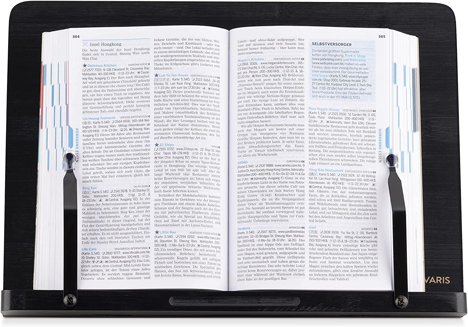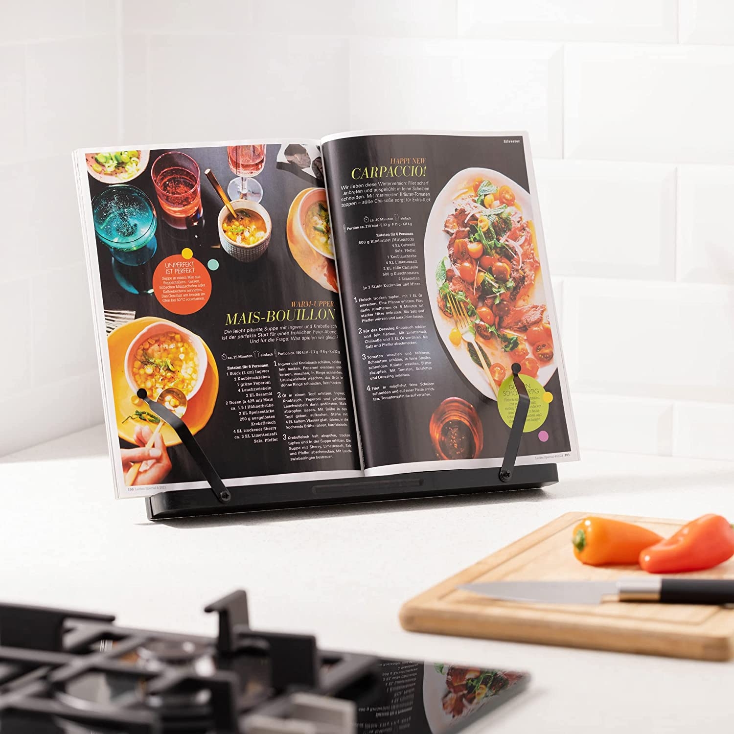 Μπορείτε να προσαρμόσετε τη γωνία της βάσης όπως επιθυμείτε, για να διευκολύνετε όσο το δυνατόν περισσότερο την ανάγνωση συνταγών και οδηγιών όταν τις χρειάζεστε. Διαθέτει διαστάσεις 33 x 24 cm και ρυθμιζόμενους βραχίονες. Έτσι, μπορείτε να το τοποθετήσετε σε μικρότερα τραπέζια ή ψηλότερους πάγκους και να έχετε πάντα το βιβλίο σας μπροστά.
