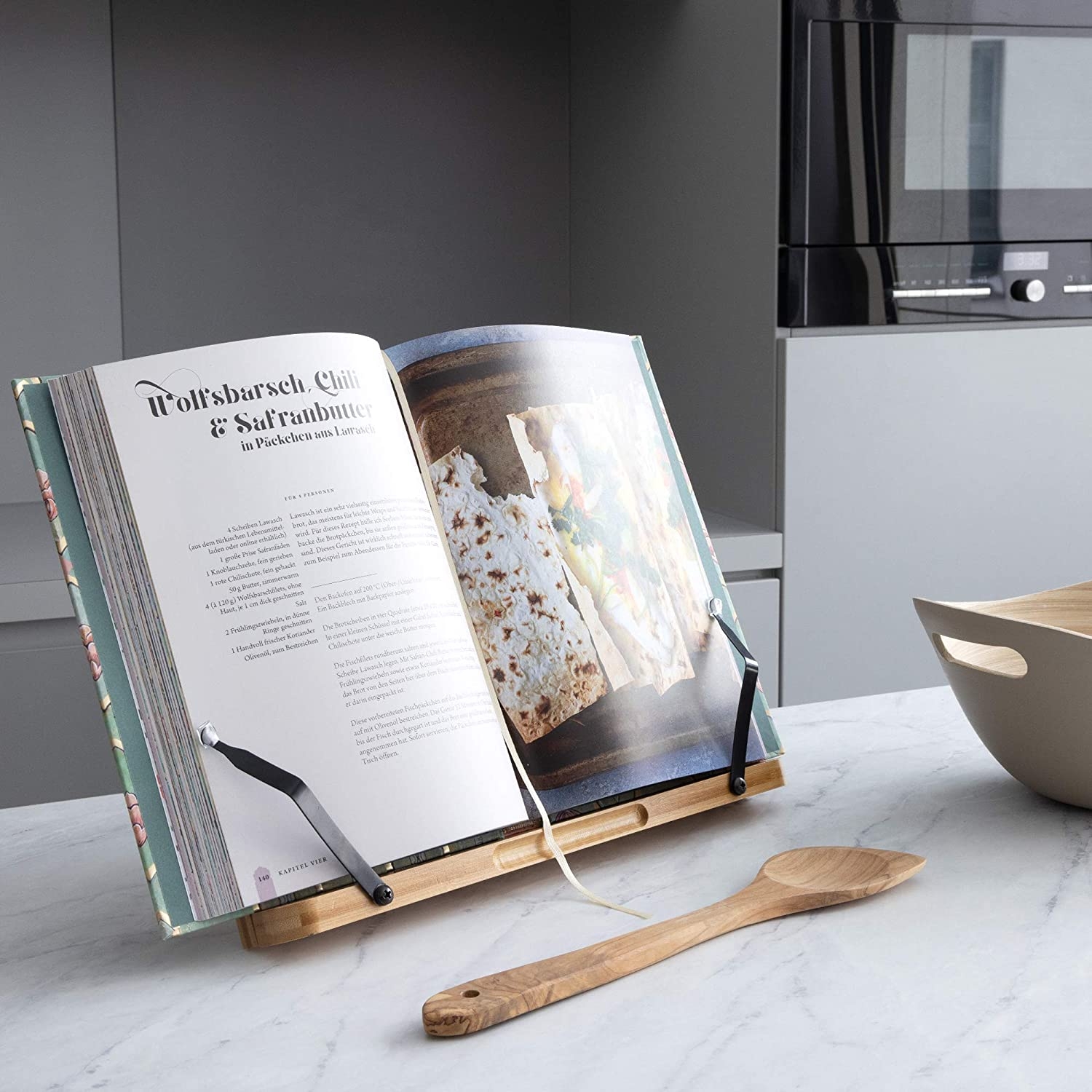Η υψηλής ποιότητας βάση ανάγνωσης βιβλίων από μπαμπού της Navaris, θα απελευθερώσει τα χέρια σας όταν μαγειρεύετε στην κουζίνα και διαβάζετε το βιβλίο συνταγών. Έτσι θα μαγειρεύετε με περισσότερη ηρεμία και ευκολία τις νέες σας συνταγές!