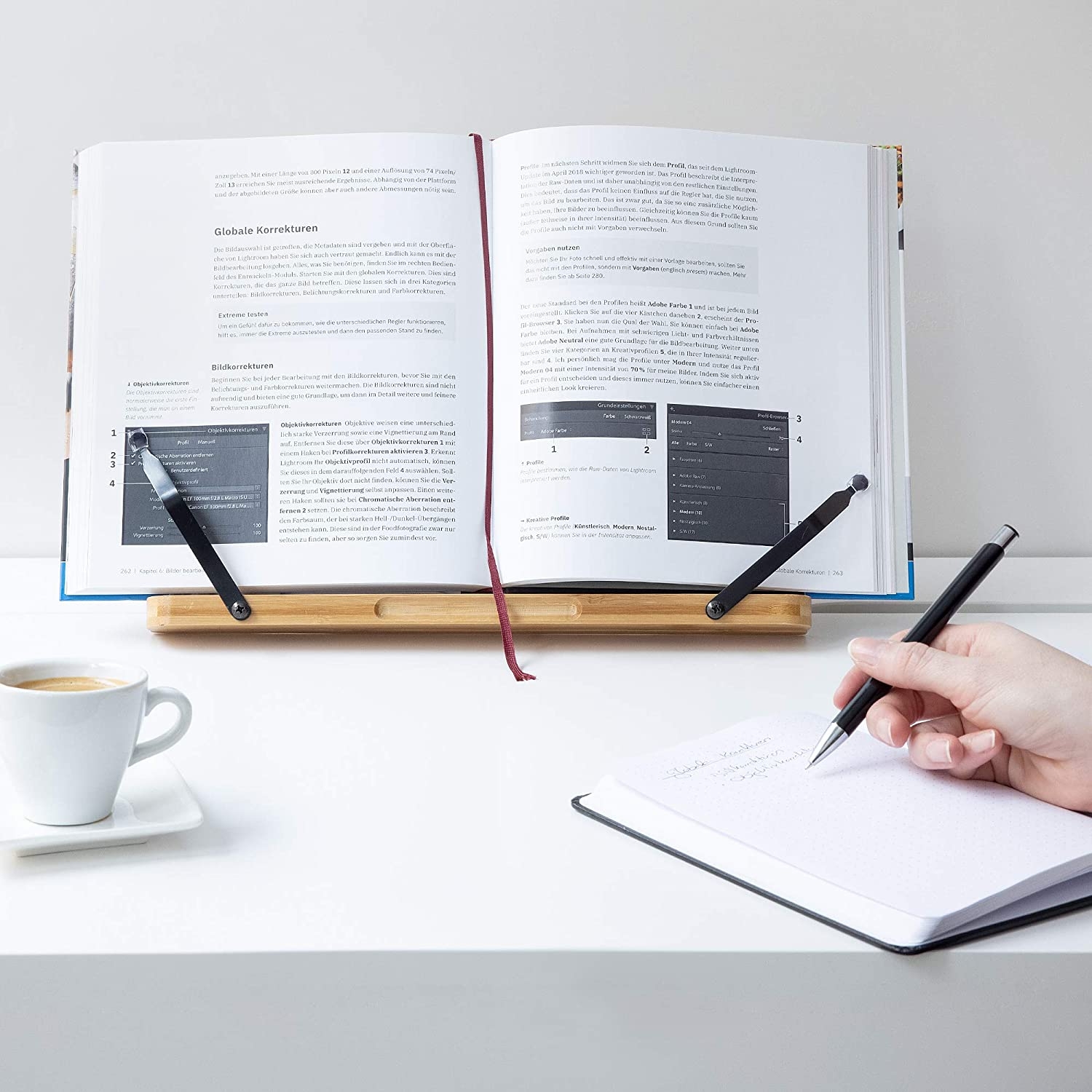 Μπορείτε να προσαρμόσετε τη γωνία της βάσης όπως επιθυμείτε, για να διευκολύνετε όσο το δυνατόν περισσότερο την ανάγνωση συνταγών και οδηγιών όταν τις χρειάζεστε. Διαθέτει διαστάσεις 33 x 24 cm και ρυθμιζόμενους βραχίονες. Έτσι, μπορείτε να το τοποθετήσετε σε μικρότερα τραπέζια ή ψηλότερους πάγκους και να έχετε πάντα το βιβλίο σας μπροστά.