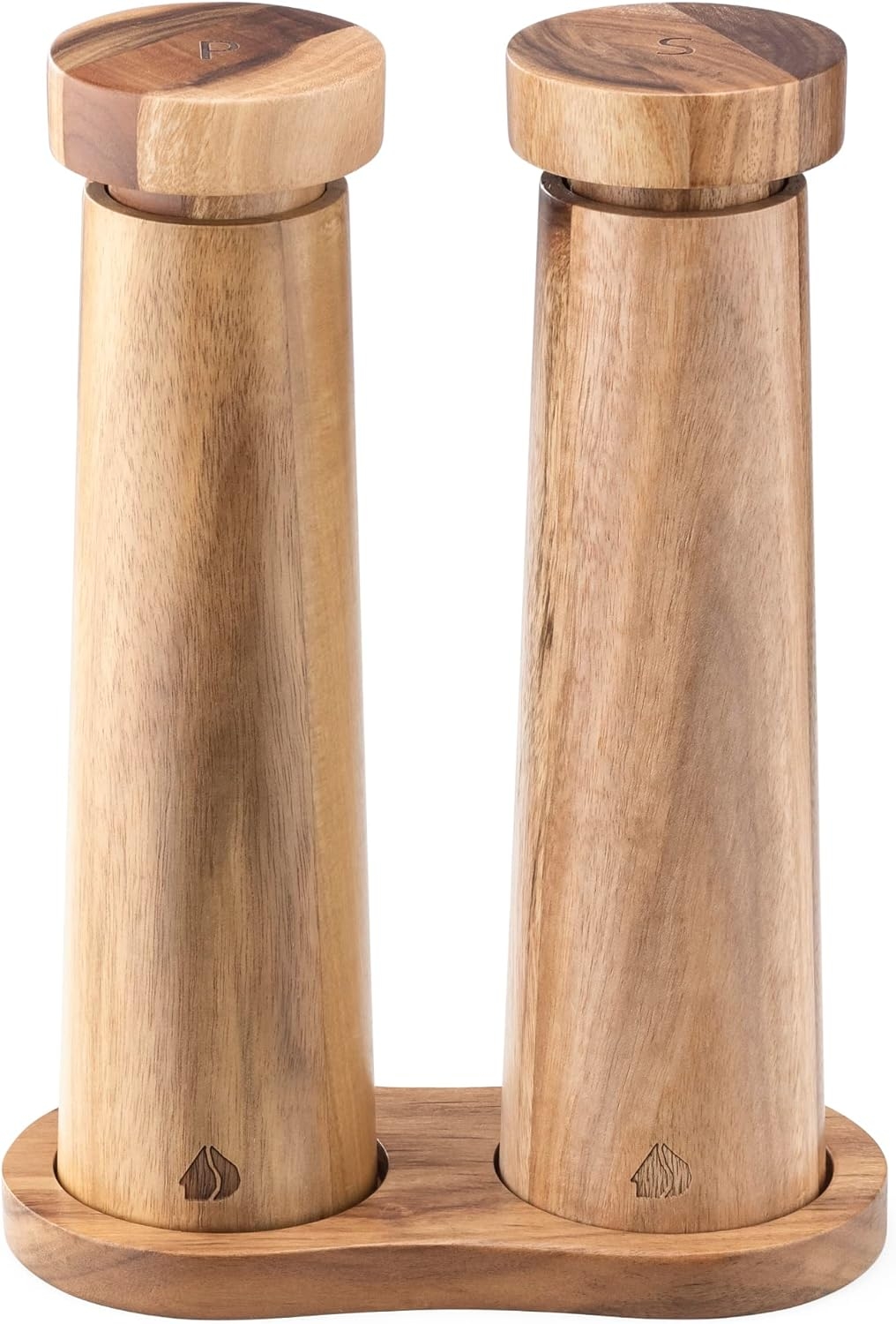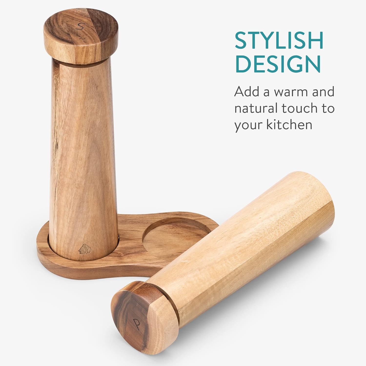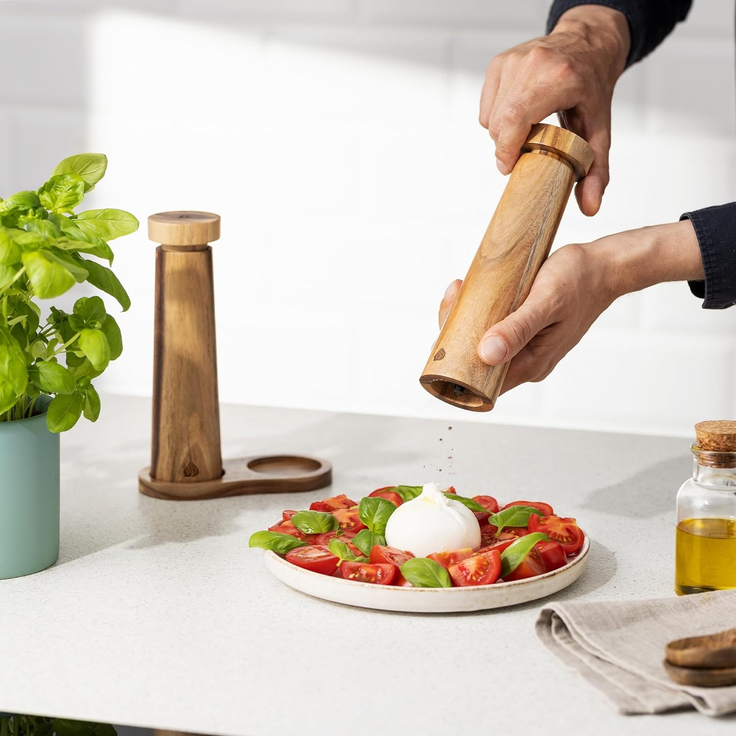 Διακοσμήστε το τραπέζι σας με αυτό το μινιμαλιστικό, σύγχρονο σετ μύλων αλατιού και πιπεριού με βάση της Navaris, που αποτελείται από υψηλής ποιότητας ξύλο ακακίας. Είναι ένα απαραίτητο σετ για όποιον αγαπά το μαγείρεμα! Διαθέτει πυρήνα λείανσης από κεραμικό, αυτό σημαίνει ότι οι μύλοι είναι μη διαβρωτικοί και δεν απορροφούν καμία γεύση.
