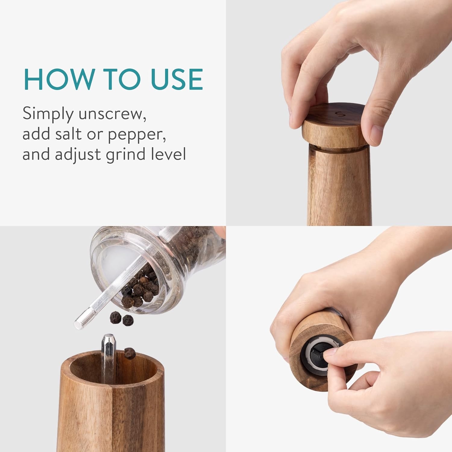 Το μόνο που χρειάζεται για να τρίψετε το αλάτι και το πιπέρι σας, είναι να το περιστρέψτε απαλά στο επάνω μέρος του και να απογειώστε το πιάτο σας! Τραβήξτε το πάνω μέρος του μύλου για να προσθέσετε το δικό σας μπαχαρικό ή καρύκευμα μέσα.