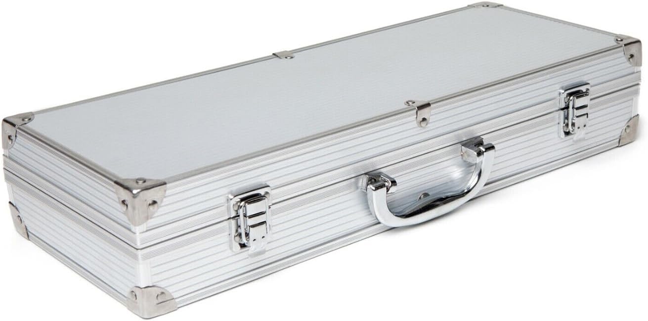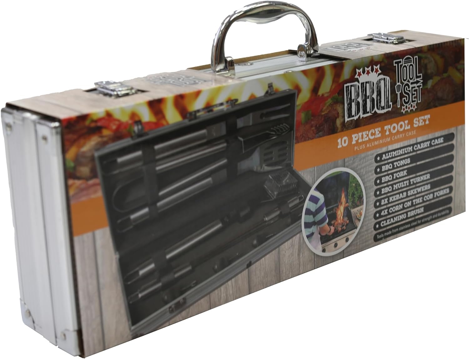 Όλα τα εργαλεία είναι συσκευασμένα σε μία ελκυστική θήκη μεταφοράς από αλουμίνιο, ενώ πλένονται στο πλυντήριο πιάτων για γρήγορο και απλό καθάρισμα. Tο σετ περιλαμβάνει, σπάτουλα, λαβίδες, πιρούνι κρέατος, σουβλάκια κεμπάπ και μία εύχρηστη πολυλειτουργική βούρτσα καθαρισμού.