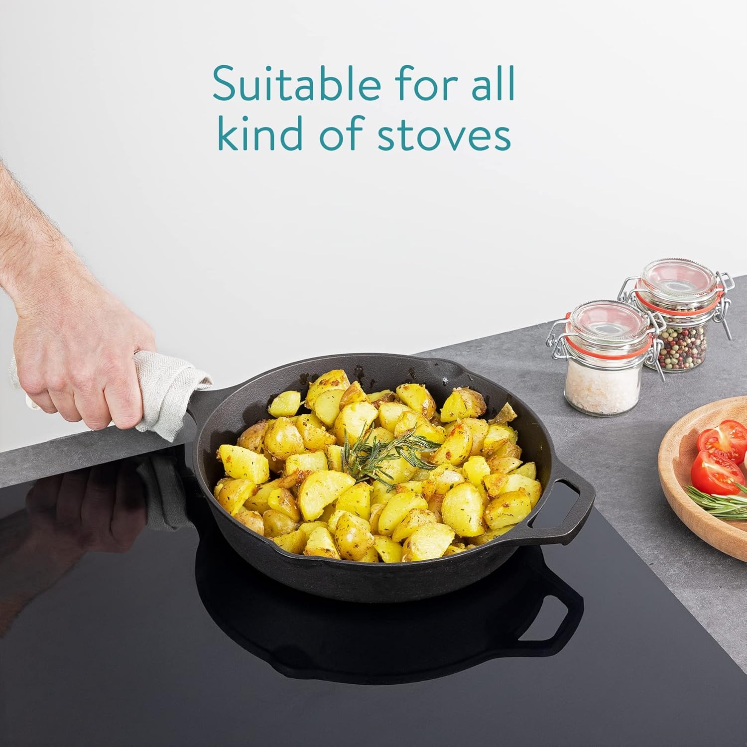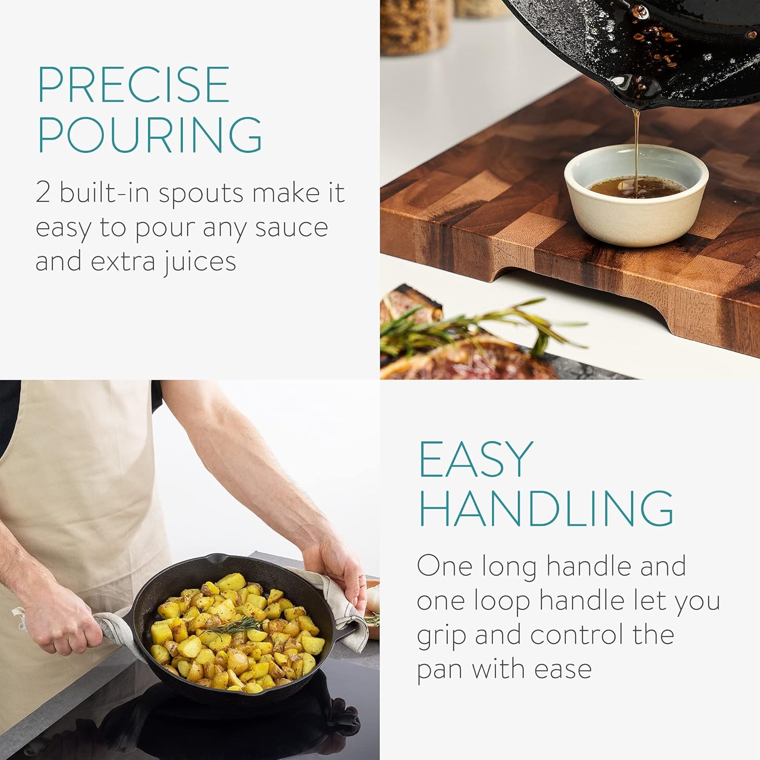 Κατασκευασμένο από χυτοσίδηρο, είναι ιδανικό για τη συγκράτηση θερμότητας και μπορεί να χρησιμοποιηθεί για μαγειρευτά φαγητά, τηγάνισμα, ψήσιμο, γκριλ, στην εστία, στον φούρνο στο μπάρμπεκιου ή ακόμα και πάνω στην φωτιά στο κάμπινγκ. Διαθέτει δύο ενσωματωμένα στόμια που διευκολύνουν την έκχυση κάθε σάλτσας και επιπλέον χυμών.