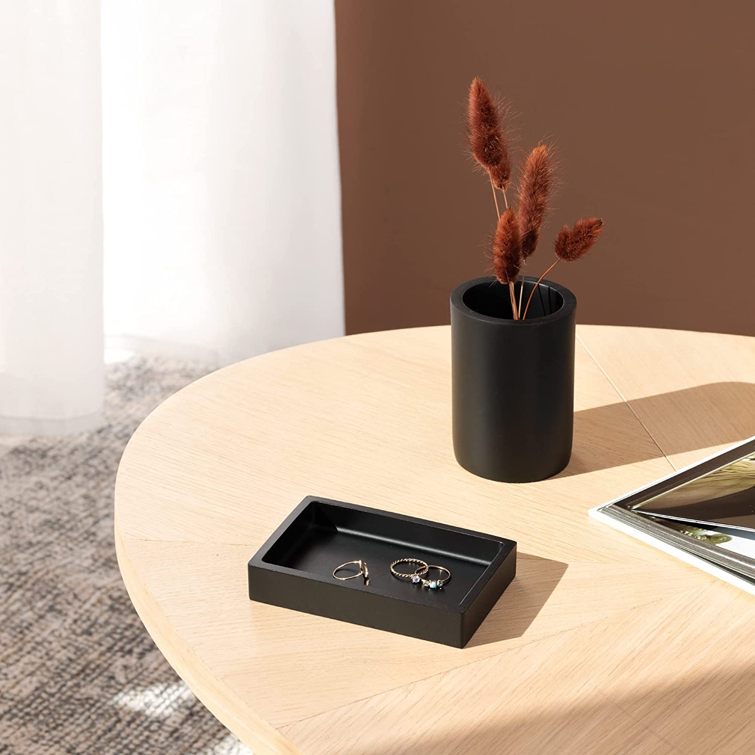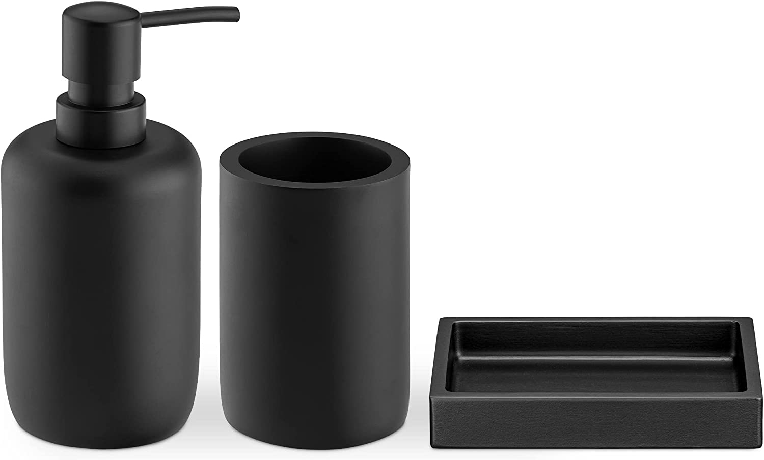 Το διακοσμητικό σετ μπάνιου της Navaris, θα χαρίσει στο μπάνιο σας κομψότητα και στυλ. Το μοναδικό σετ σε μαύρο χρώμα μπορεί να χρησιμοποιηθεί είτε σαν σετ των τριών είτε το καθένα ξεχωριστά. Θα διαμορφώσετε το μπάνιο σας εύκολα και χωρίς πολύ κόπο.