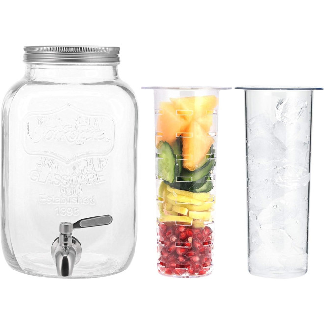 Η εύκολη στην εγκατάσταση βρύση επιτρέπει την άμεση και άνετη ροή των ποτών, ιδανική για να γεμίζετε τα ποτήρια των καλεσμένων σας με μια απλή στροφή. Το ένθετο πάγου εξασφαλίζει ότι τα ποτά παραμένουν παγωμένα χωρίς να αραιώνονται, ενώ η συσκευή έγχυσης φρούτων προσθέτει μια φρουτένια νότα σε κάθε ρόφημα, δίνοντάς του μια ξεχωριστή γεύση.