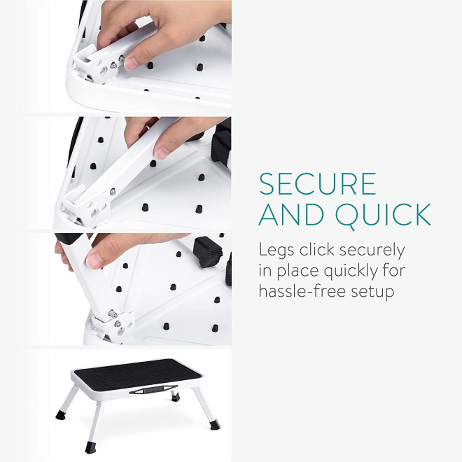 Τα αντιολισθητικά πόδια του σκαλοπατιού εξασφαλίζουν μια ασφαλή βάση και αποτρέπει τη δημιουργία γρατζουνιών στις επιφάνειες. Επίσης διαθέτει μία εύχρηστη λαβή για την εύκολη μεταφορά του.