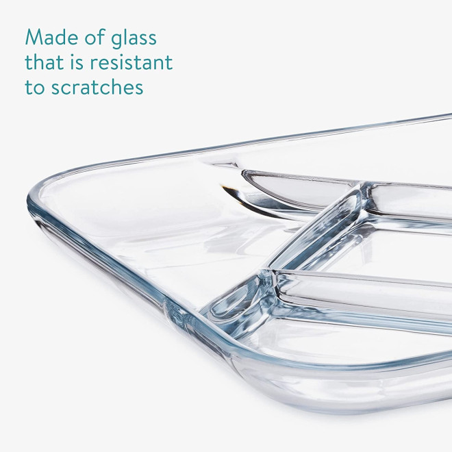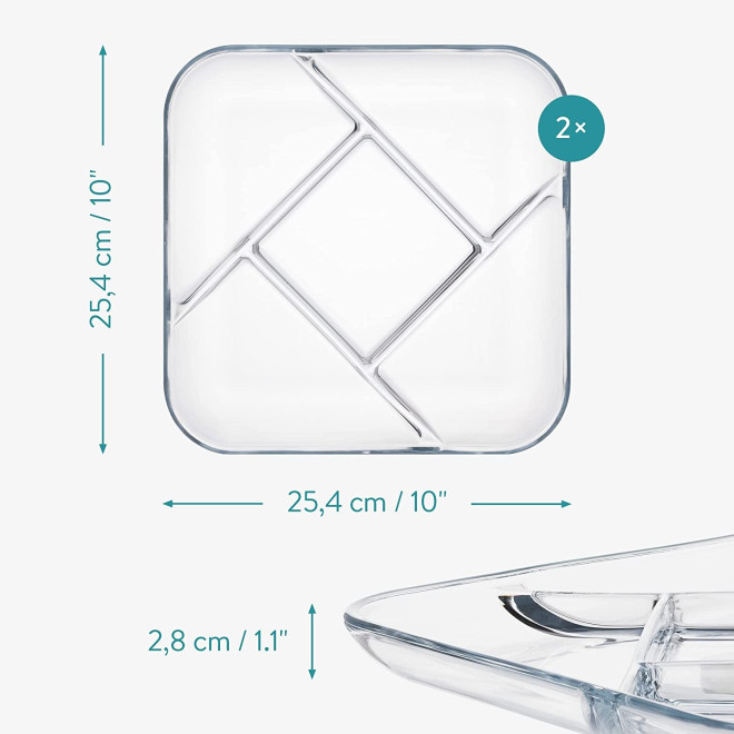 Οι πιατέλες είναι κατασκευασμένες από ανθεκτικό σκληρυμένο γυαλί, το οποίο είναι ασφαλές για χρήση στο φούρνο μικροκυμάτων, στο πλυντήριο πιάτων και στο ψυγείο. Έχει το ιδανικό μέγεθος, καθώς έχεις τετράγωνες διαστάσεις 25.4cm και ύψος 2.8cm. Οι γυάλινες πιατέλες θα σας βοηθήσουν να έχετε μία νόστιμη παρουσίαση στο τραπέζι σας, ενώ το φαγητό σας δεν θα ανακατευτεί ή μουσκευτεί από τις συνοδευτικές σάλτσες.