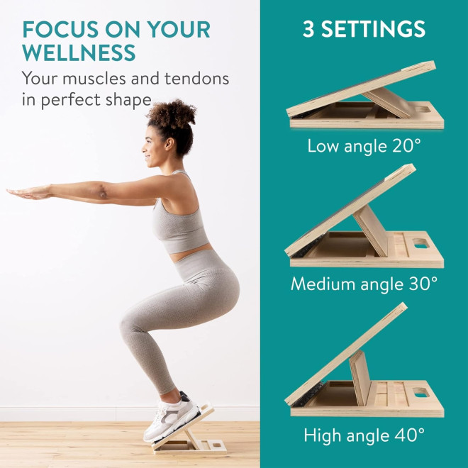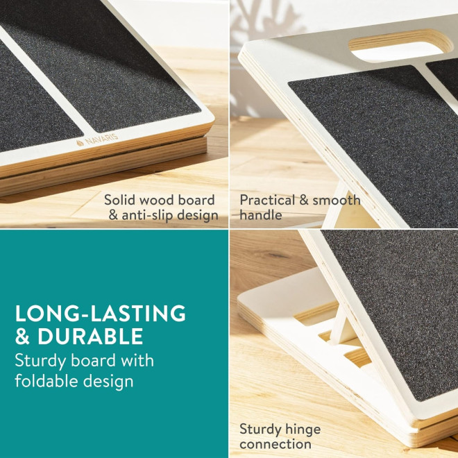 Είναι κατασκευασμένη από υψηλής ποιότητας ξύλο κόντρα πλακέ, διαθέτει συμπαγή σχεδιασμό και μπορεί να διπλωθεί για την αποθήκευση ή μεταφορά της όταν δεν χρησιμοποιείται. Ρυθμίστε την κλίση της σανίδας από ήπια κλίση σε μια πιο έντονη ανηφορική κλίση, προσφέροντάς σας τρις διαφορετικές γωνίες. Επιπλέον, χάρη στην αντιολισθητική επιφάνεια που διαθέτει, προσφέρει σταθερότητα στα πόδια σας.
