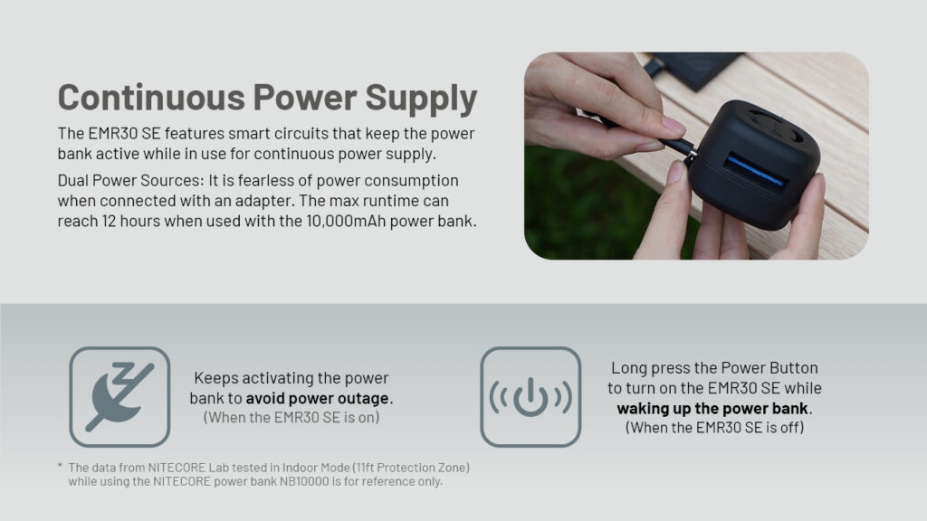 Το EMR30 SE διαθέτει ένα έξυπνο κύκλωμα που κρατά το PowerΒank (δεν περιλαμβάνεται) ενεργό όταν είναι συνδεδεμένο για συνεχόμενη παροχή ενέργειας, ενώ δεν φοβάται την κατανάλωση ενέργειας όταν συνδέεται με έναν προσαρμογέα. Ο μέγιστος χρόνος λειτουργίας μπορεί να φτάσει τις 12 ώρες όταν χρησιμοποιείται με ένα PowerΒank 10000mAh.