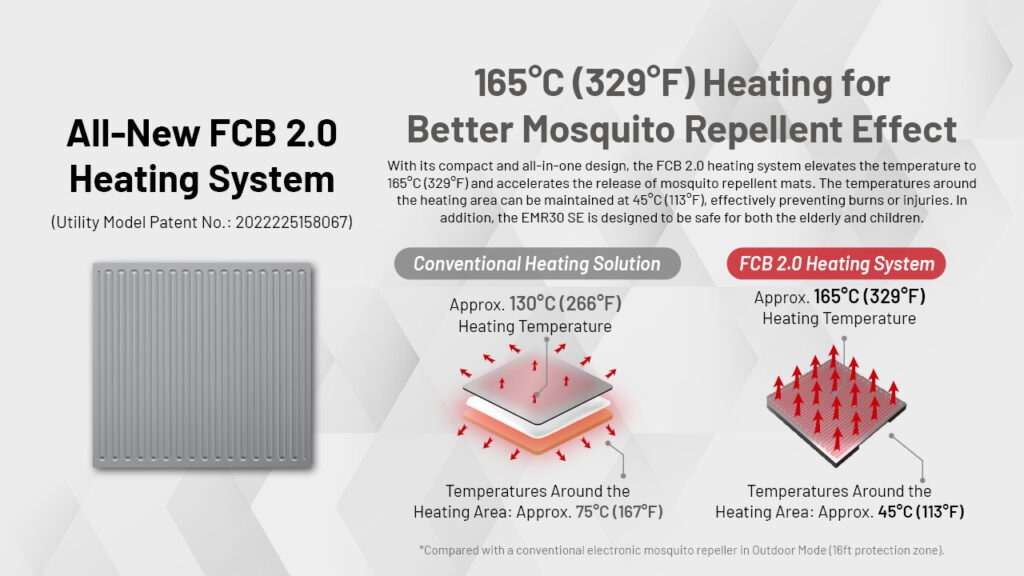 Σχεδιασμένο με ολοκαίνουριο σύστημα θέρμανσης FCB 2.0, με δίπλωμα ευρεσιτεχνίας μοντέλου χρήσης No.2022225158067 165C° για καλύτερο αποτέλεσμα απώθησης κουνουπιών. Με τον μικρό και όλα σε ένα σχεδιασμό, το σύστημα θέρμανσης FCB 2.0 ανεβάζει την θερμοκρασία στους 165C° και επιταχύνει την απελευθέρωση του συστατικού της ταμπλέτας.