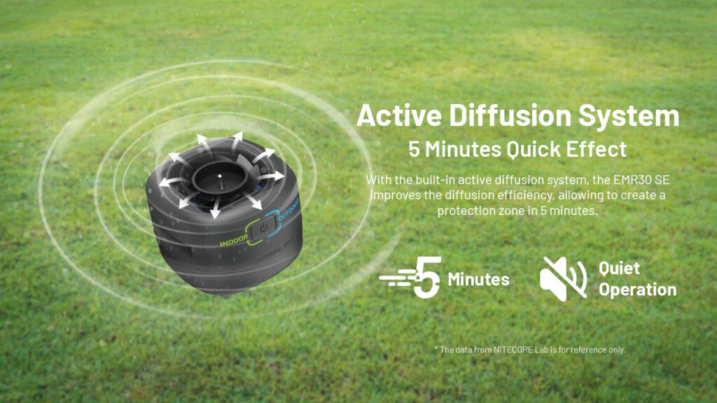 Χάρη στο ενσωματωμένο σύστημα ενεργής διάχυσης, το EMR30 SE βελτιώνει την αποτελεσματικότητα της διάχυσης, επιτρέποντας να δημιουργήσει μία ζώνη ασφάλειας μέσα σε 5 λεπτά με αθόρυβη λειτουργία. Ο ενσωματωμένος ανεμιστήρας επιτρέπει στο συστατικό της ταμπλέτας, η απώθηση των κουνουπιών να διαχέεται γρήγορα και ισχυρά με αντοχή στον άνεμο. Ως εκ τούτου το EMR30 SE μπορεί να συνεχίσει να είναι αποτελεσματικό στην απώθηση των κουνουπιών σε εξωτερικό περιβάλλον.