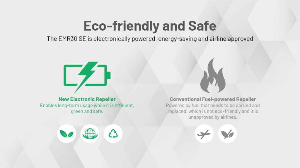 Είναι φιλικό προς το περιβάλλον και ασφαλές, καθώς είναι τροφοδοτούμενο ηλεκτρονικά και χαμηλής κατανάλωσης, έτσι είναι εγκεκριμένο από τις αεροπορικές εταιρίες. Με το EMR30 SE μπορείτε να εξοικονομήστε ενέργεια και χρήματα! Επίσης, διαθέτει ευανάγνωστες και φιλικές προς τον χρήστη ενδείξεις λειτουργίας, με πράσινο χρώμα καταδεικνύεται το πρόγραμμα λειτουργίας εσωτερικού χώρου, ενώ με σιέλ χρώμα καταδεικνύεται το πρόγραμμα λειτουργίας εξωτερικού χώρου.