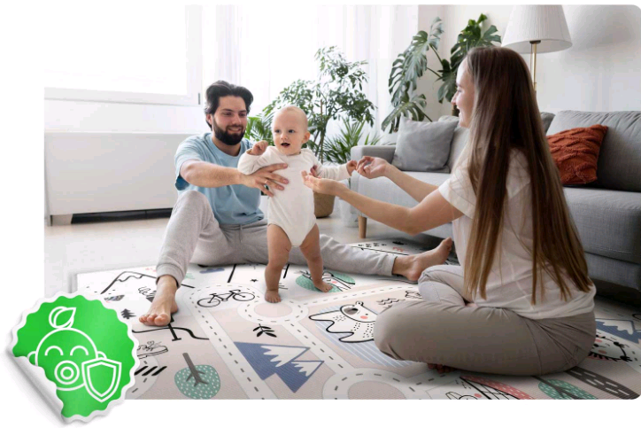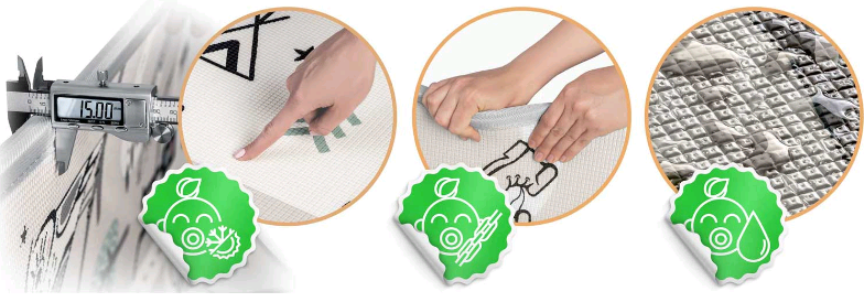 Το χαλάκι αυτό είναι ιδανικό την ασφάλεια των παιδιών, καθώς δεν περιέχει δισφαινόλη Α (BPA), PVC, φθαλικές ενώσεις ή φορμαμίδιο. Πληροί τα αυστηρά ευρωπαϊκά πρότυπα ασφαλείας, ενώ διαθέτει το Ευρωπαϊκό Πιστοποιητικό CE και έχει περάσει τις δοκιμές EN71-1, EN71-2 και EN71-3. Είναι επίσης τέλειο για παιδιά με ευαισθησίες ή αλλεργίες, καθώς δεν μαζεύει σκόνη ή ακάρεα.