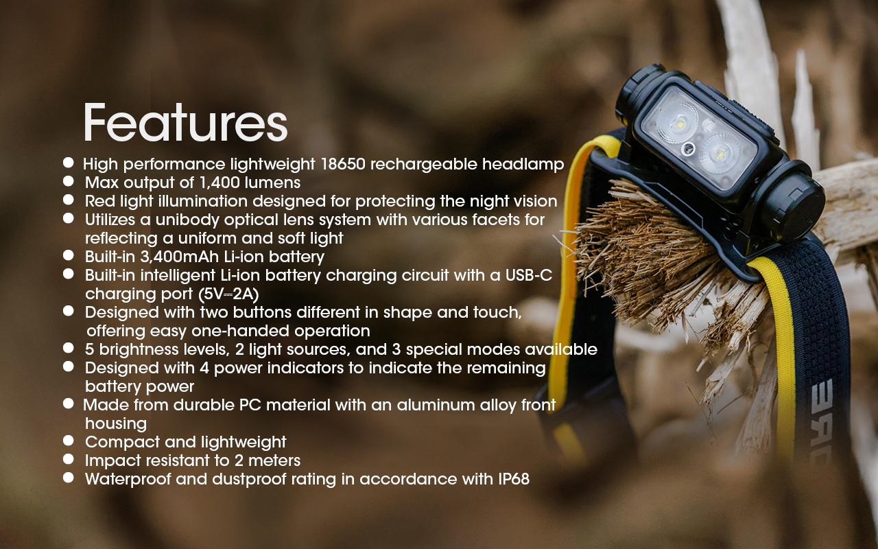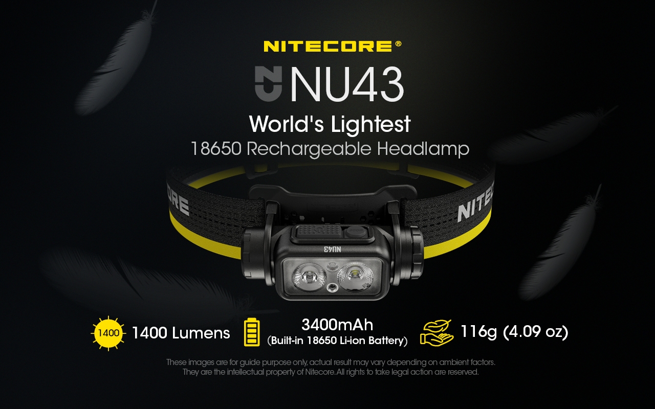 Ο παγκοσμίως ελαφρύτερος επαναφορτιζόμενος φακός κεφαλής NU43 της Nitecore λειτουργεί με μπαταρία 18650, διαθέτει μέγιστη ισχύ 1400 Lumens, ενσωματωμένη μπαταρία ιόντων λιθίου 18650 χωρητικότητας 3400mAh και βάρος μόλις 116g! Είναι ελαφρύτερος αλλά ισχυρότερος!