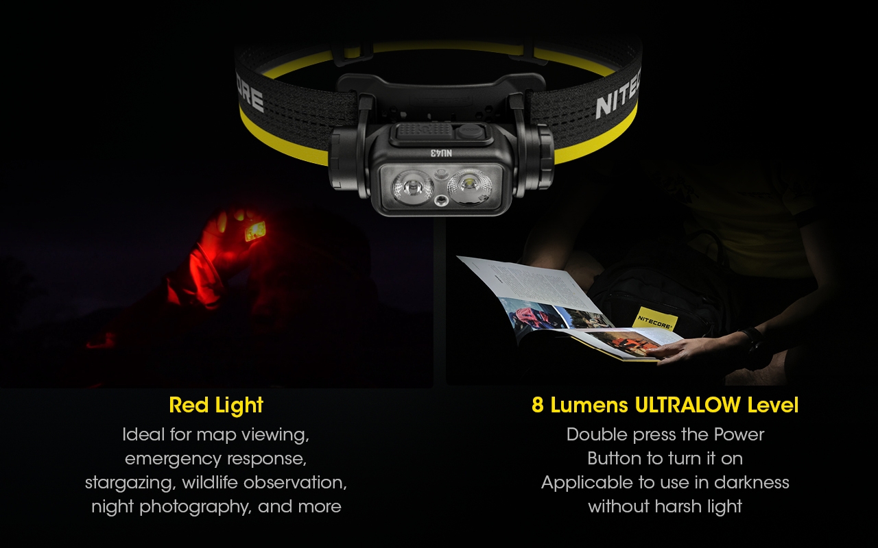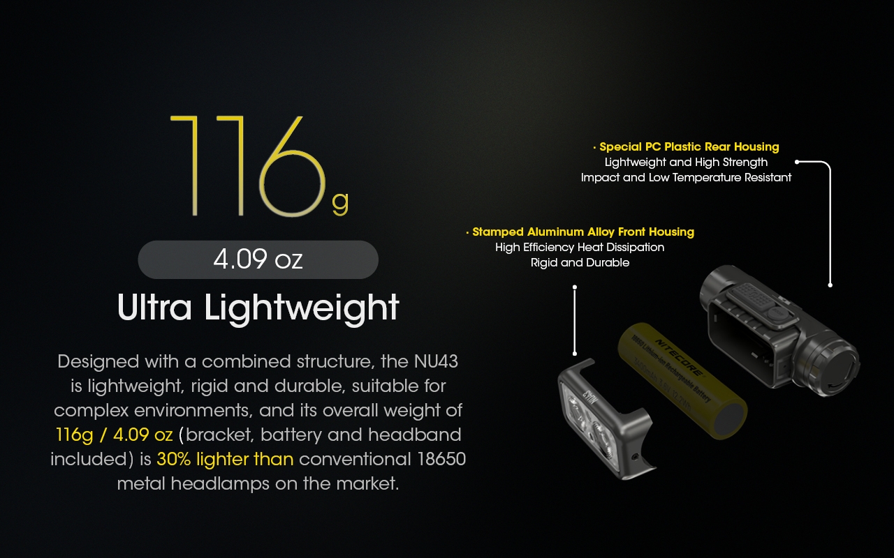 Χάρη στην εκτυφλωτική δέσμη 1400 Lumens, είναι ιδανικός για νυχτερινή αναζήτηση και ανίχνευση. Η ενσωματωμένη επαναφορτιζόμενη μπαταρία 18650 / 3400mAh εξασφαλίζει σταθερό φωτισμό όλη την νύχτα, 29 ώρες στον χαμηλό φωτισμό 100Lumens, 15 ώρες στον μεσαίο φωτισμό 300Lumens, 10 ώρες στον υψηλό φωτισμό 600 Lumens. Είναι σχεδιασμένος με μία συνδυαστική κατασκευή. Ο NU43 είναι ελαφρύς, άκαμπτος και ανθεκτικός, ιδανικός για περίπλοκα περιβάλλοντα και το συνολικό του βάρος των 116g, δηλαδή η βάση, ο ιμάντας και η μπαταρία, τα οποία περιλαμβάνονται, είναι ελαφρύτερο κατά 30% από τους κοινούς φακούς που χρησιμοποιούν μπαταρία 18650.