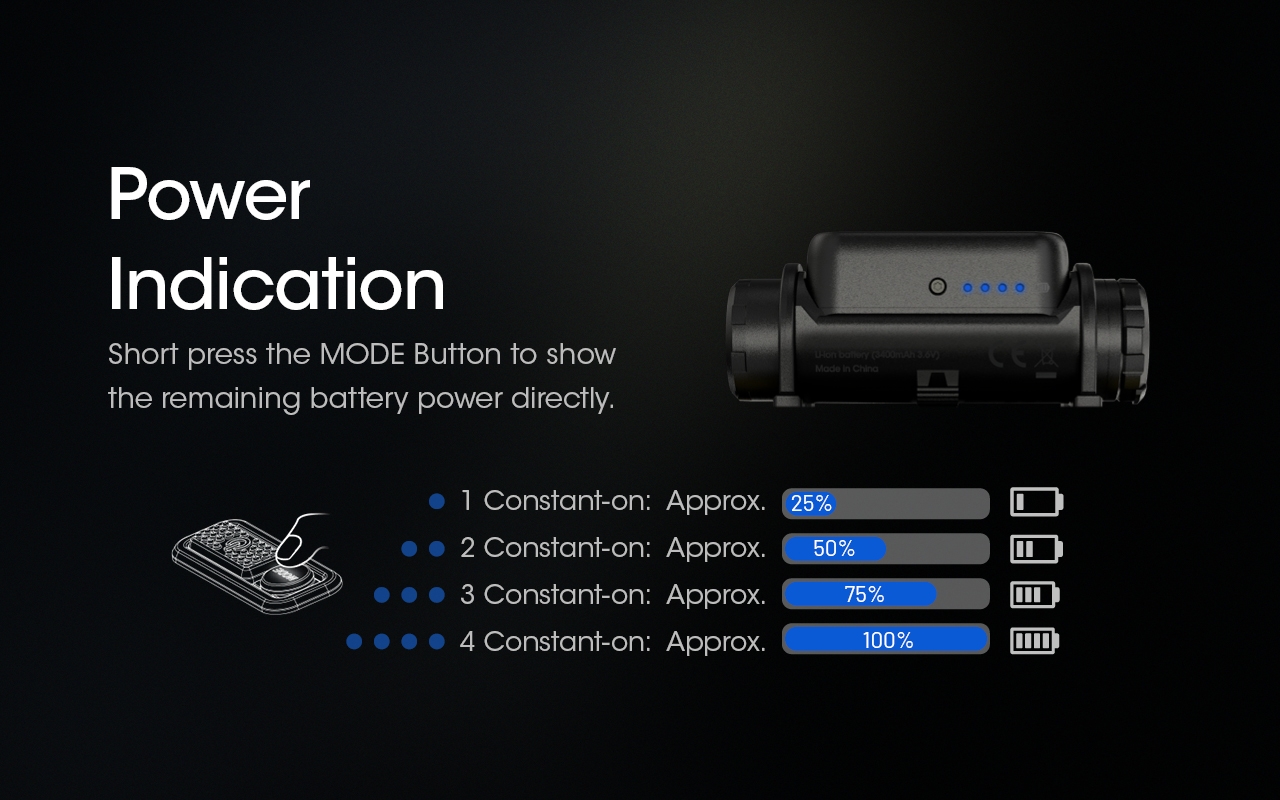 Έχει ενδεικτικές λυχνίες ισχύος, όπου το σύντομο πάτημα του κομβίου λειτουργιών (Mode) καταδεικνύει την ενέργεια που έχει απομείνει στην μπαταρία. Μία ενδεικτική λυχνία αναμμένη σημαίνει ότι η ενέργεια βρίσκεται κοντά στο 25%. Δύο ενδεικτικές λυχνίες αναμμένες σημαίνουν ότι η ενέργεια βρίσκεται κοντά στο 50%. Τρεις ενδεικτικές λυχνίες αναμμένες σημαίνουν ότι η ενέργεια βρίσκεται κοντά στο 75%. Τέσσερις ενδεικτικές λυχνίες αναμμένες σημαίνουν ότι η ενέργεια βρίσκεται κοντά στο 100%.