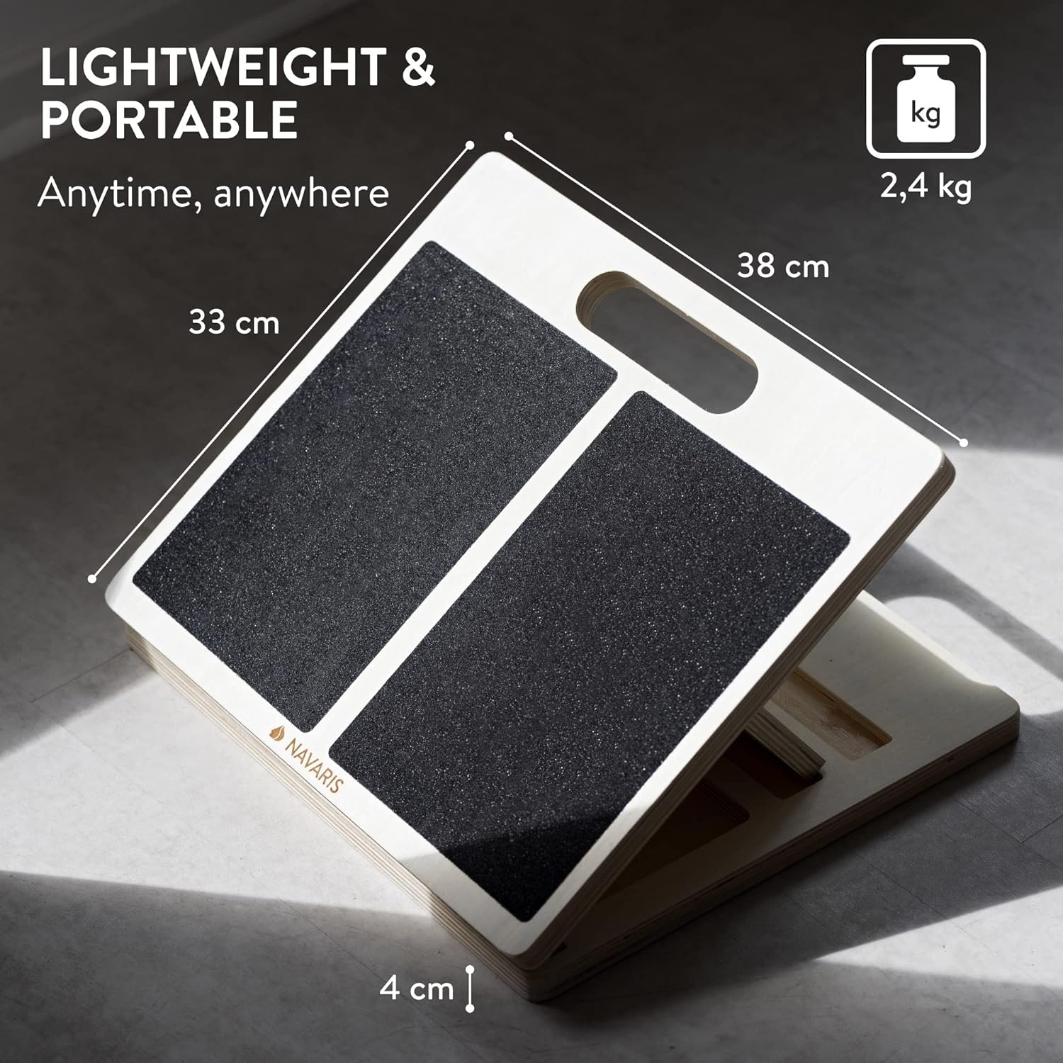 Προσθέστε τη ξύλινη αντιολισθητική σανίδα της Navaris στην καθημερινότητά σας και ανακουφίστε τις γάμπες σας κάνοντας μεγάλες διατάσεις! Είναι ιδανική για το σωστό τέντωμα των μυών, του κάτω ποδιού πριν και μετά την άσκησή σας στο σπίτι. Προσαρμόζεται σε διαφορετικές γωνίες, ανάλογα με την απαιτούμενη έκταση ή το επίπεδο δυσκολίας που θέλετε.