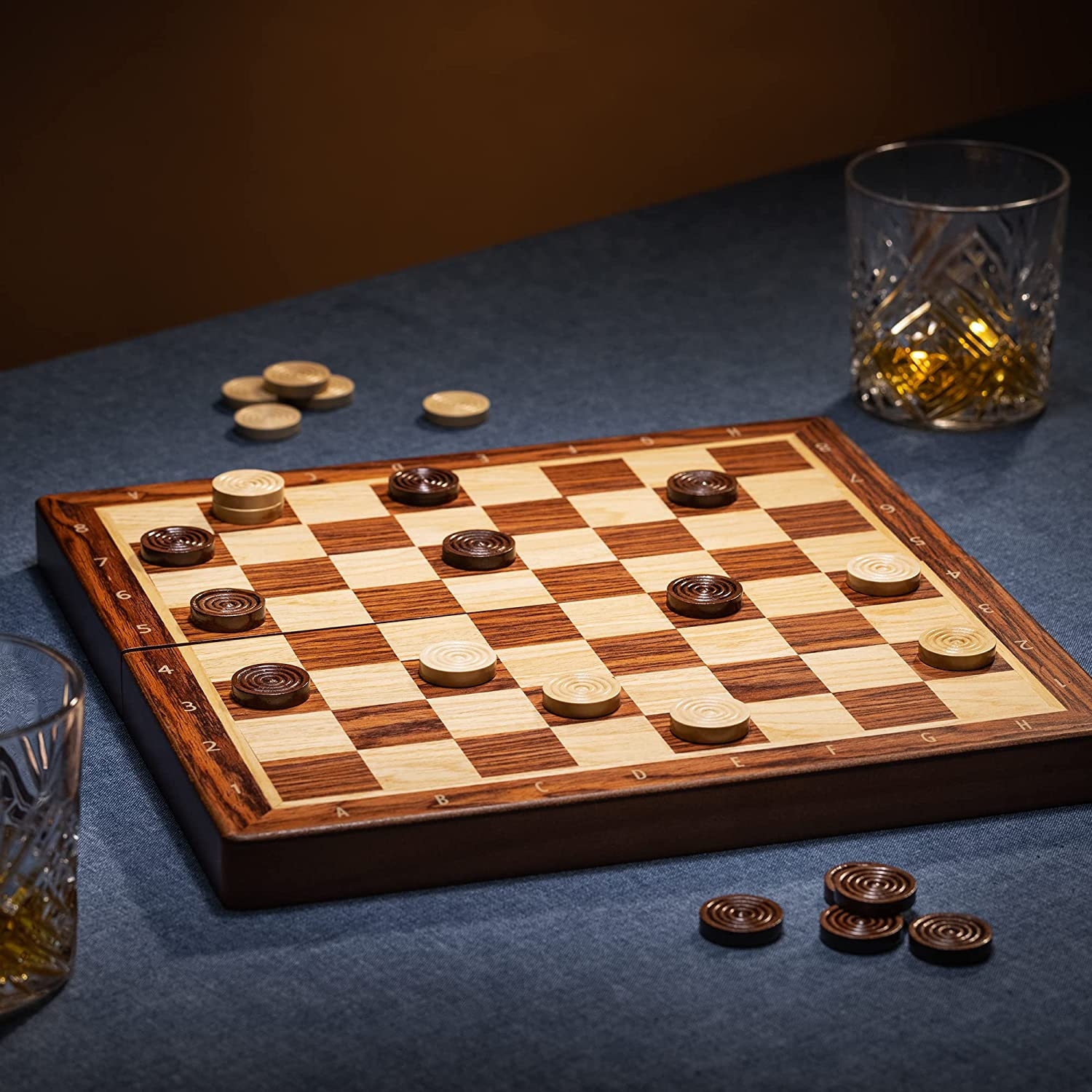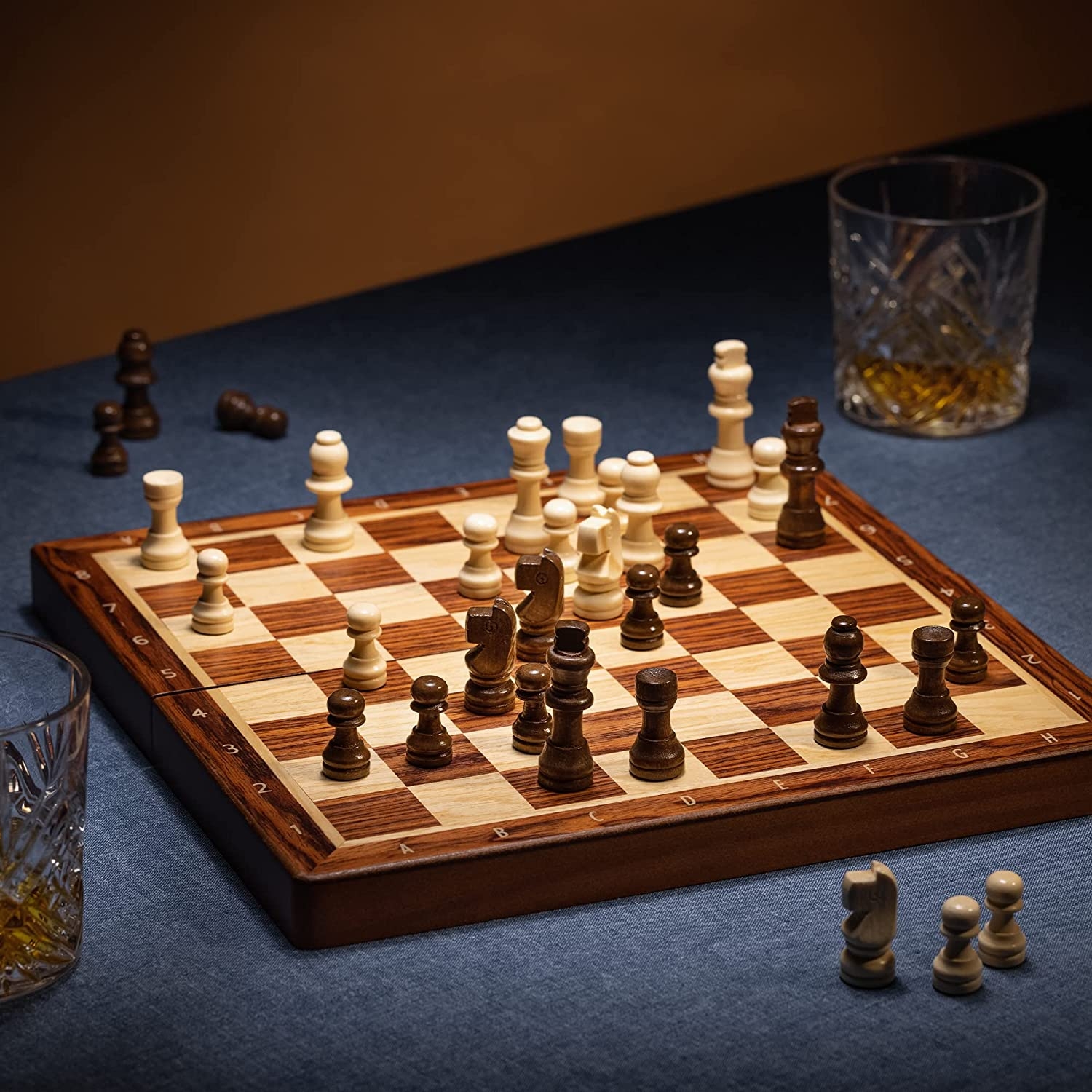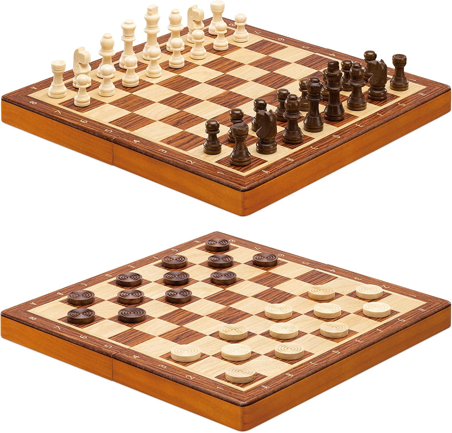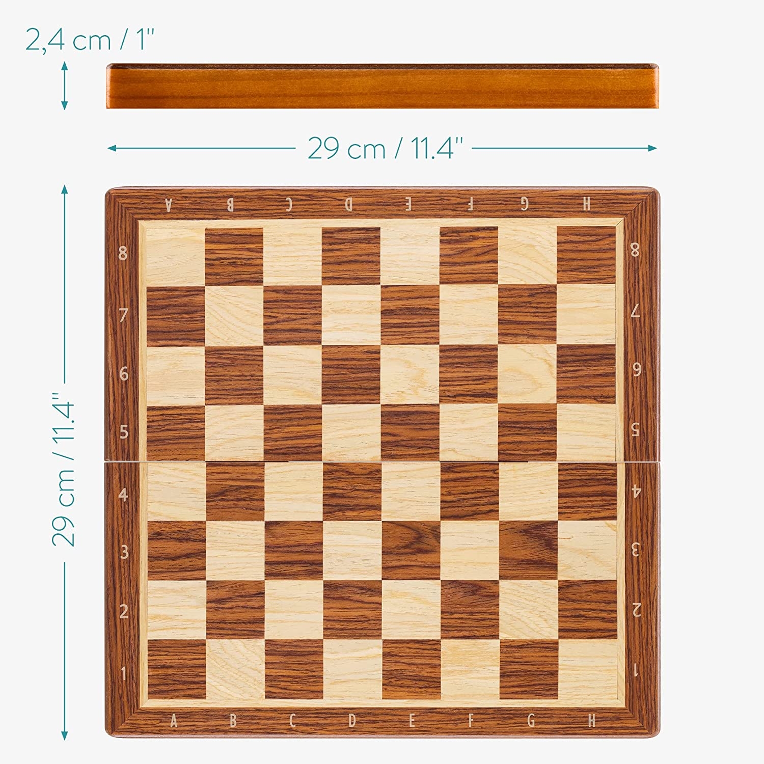 Αν παίζετε και συμμετάσχετε σε αγώνες σκάκι ή ντάμας, ή αν απλά θέλετε να διασκεδάσετε παίζοντας, αυτό το σετ σκακιού είναι τέλειο για ένα παιχνίδι όπου κι αν βρεθείτε. Επίσης, όλα τα πιόνια και πούλια μπορούν να αποθηκευτούν στο ταμπλό μόλις διπλωθεί. Είναι σχεδιασμένο με φυσικά χρώματα ξύλου, σκούρο και ανοιχτό καφέ, με λείο φινίρισμα.
