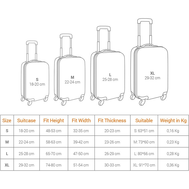 Είναι κατάλληλο για μέγεθος βαλίτσας 74-80 x 51-54 x 30-33 cm και διαθέτει όλες τις απαραίτητες εγκοπές για την απρόσκοπτη λειτουργία της αποσκευής σας, έτσι η επεκτεινόμενη λαβή αλλά και η λαβή στο πλάι δεν καλύπτονται.