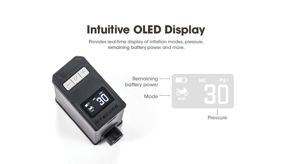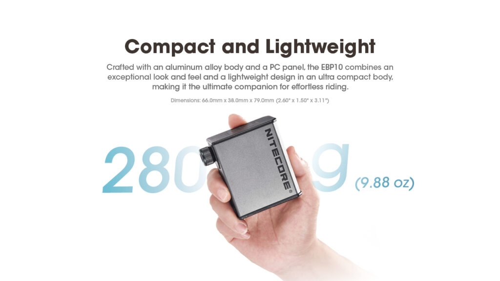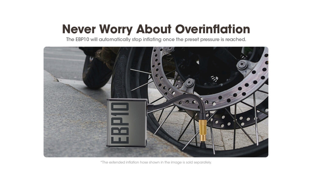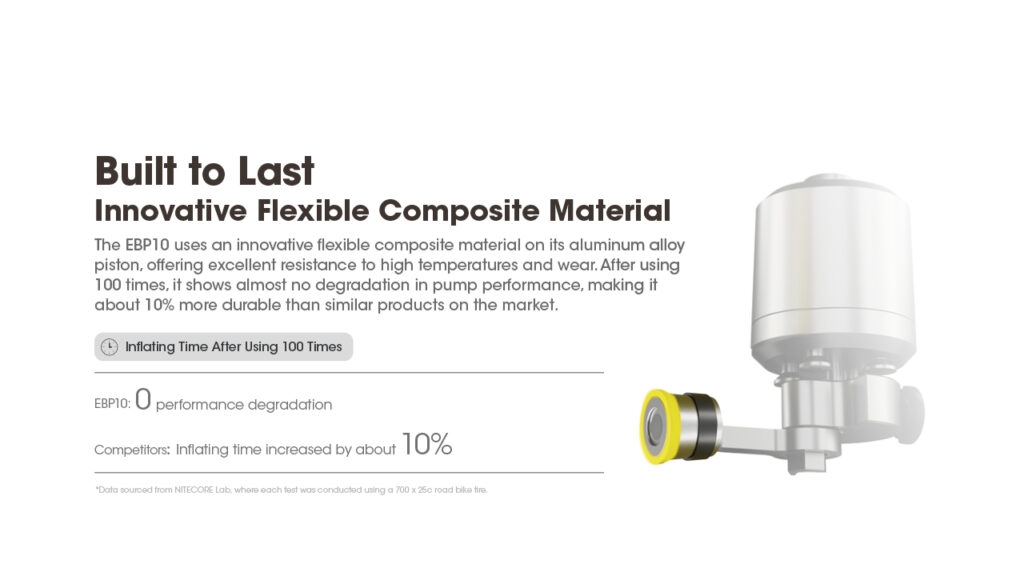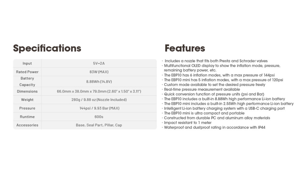 Κατασκευασμένη από ανθεκτικά υλικά όπως κράμα αλουμινίου και PC, η EBP10 συνδυάζει την ανθεκτικότητα με την κομψότητα. Οι διαστάσεις της και το ελαφρύ της σώμα την καθιστούν ιδανική για κάθε ποδηλατική σας διαδρομή. Με καινοτόμες λειτουργίες, όπως έξυπνη οθόνη OLED, προβάλλει σε πραγματικό χρόνο τις πληροφορίες πλήρωσης, την πίεση και την υπολειπόμενη ισχύ της μπαταρίας.