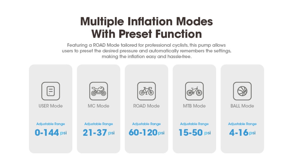 Με το μοτέρ χωρίς ψήκτρες και τον θάλαμο από αλουμίνιο υψηλής ακριβείας 0,01 χιλιοστών, επεξεργασμένο με CNC κράμα αλουμινίου, προσφέρει εξαιρετική σταθερότητα και απόδοση. Η λειτουργία προεπιλογής επιτρέπει στους επαγγελματίες ποδηλάτες να προκαθορίσουν την επιθυμητή πίεση, κάνοντας το φούσκωμα εύκολο και χωρίς προβλήματα.