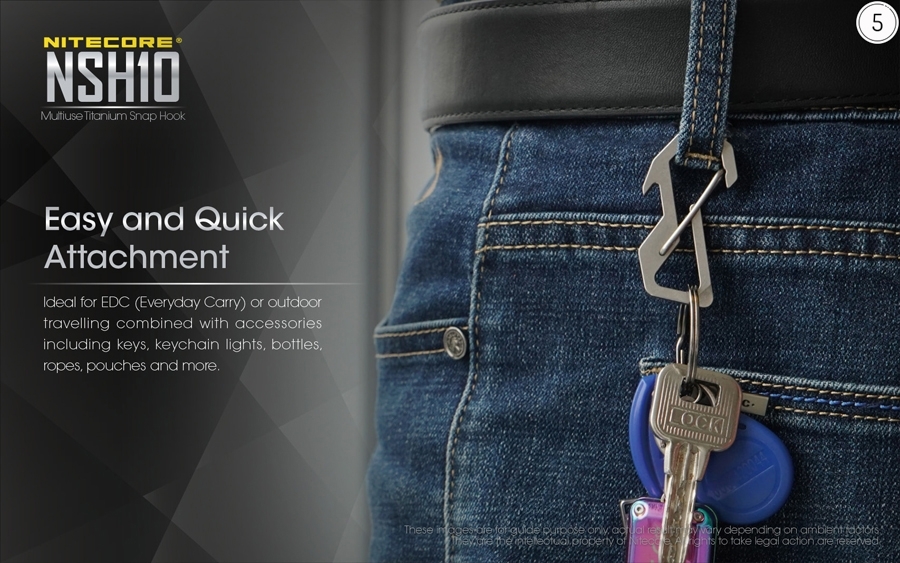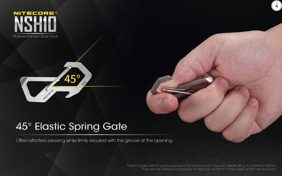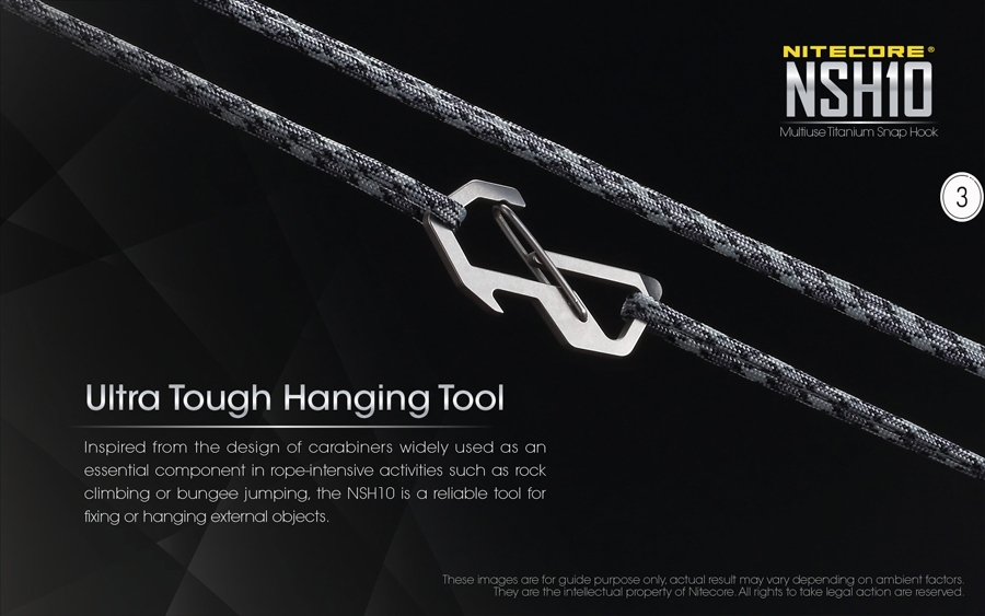 Εμπνευσμένος από το σχεδιασμό των καραμπίνερ που χρησιμοποιούνται σε εντατικές δραστηριότητες όπως η αναρρίχηση και το άλμα bungee, ο NSH10 είναι ένα αξιόπιστο εργαλείο για την τοποθέτηση ή την ανάρτηση εξωτερικών αντικειμένων. Μπορείτε να το συνδυάσετε με άλλα αξεσουάρ, όπως κλειδιά, φακούς, ανοιχτήρια, σχοινιά, θήκες κλπ.