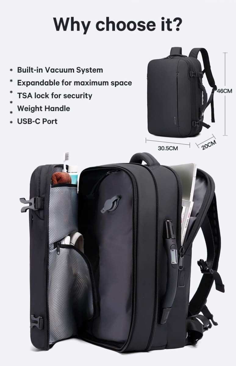 Το σακίδιο συνοδεύεται από μία ειδική υποδοχή απορρόφησης αέρα, που σας επιτρέπει να αφαιρείτε τον περιττό αέρα από το εσωτερικό του. Έτσι, μπορείτε να αποθηκεύσετε περισσότερα ρούχα και να εξοικονομήσετε πολύτιμο χώρο κατά τη διάρκεια των ταξιδιών σας. Είναι ο ιδανικός σύντροφος για το σχολείο, τις καθημερινές μετακινήσεις, επαγγελματικά ταξίδια, πεζοπορίες, εκδρομές, κάμπινγκ και κάθε είδους υπαίθριες δραστηριότητες.