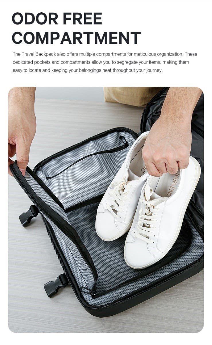 Η κύρια θήκη προσφέρει άφθονο χώρο, μπορεί να χωρέσει τα ταξιδιωτικά σας είδη, όπως ρούχα 5-8 τεμαχίων. Το μπροστινό διαμέρισμα είναι ιδανικό για την αποθήκευση περιοδικών, iPad ή βιβλίων, ενώ διαθέτει και ειδική θέση για φορητό υπολογιστή έως 17,3 ιντσών. Στο εσωτερικό θα βρείτε ξεχωριστή θήκη για παπούτσια, για ακόμη καλύτερη οργάνωση και υγιεινή.