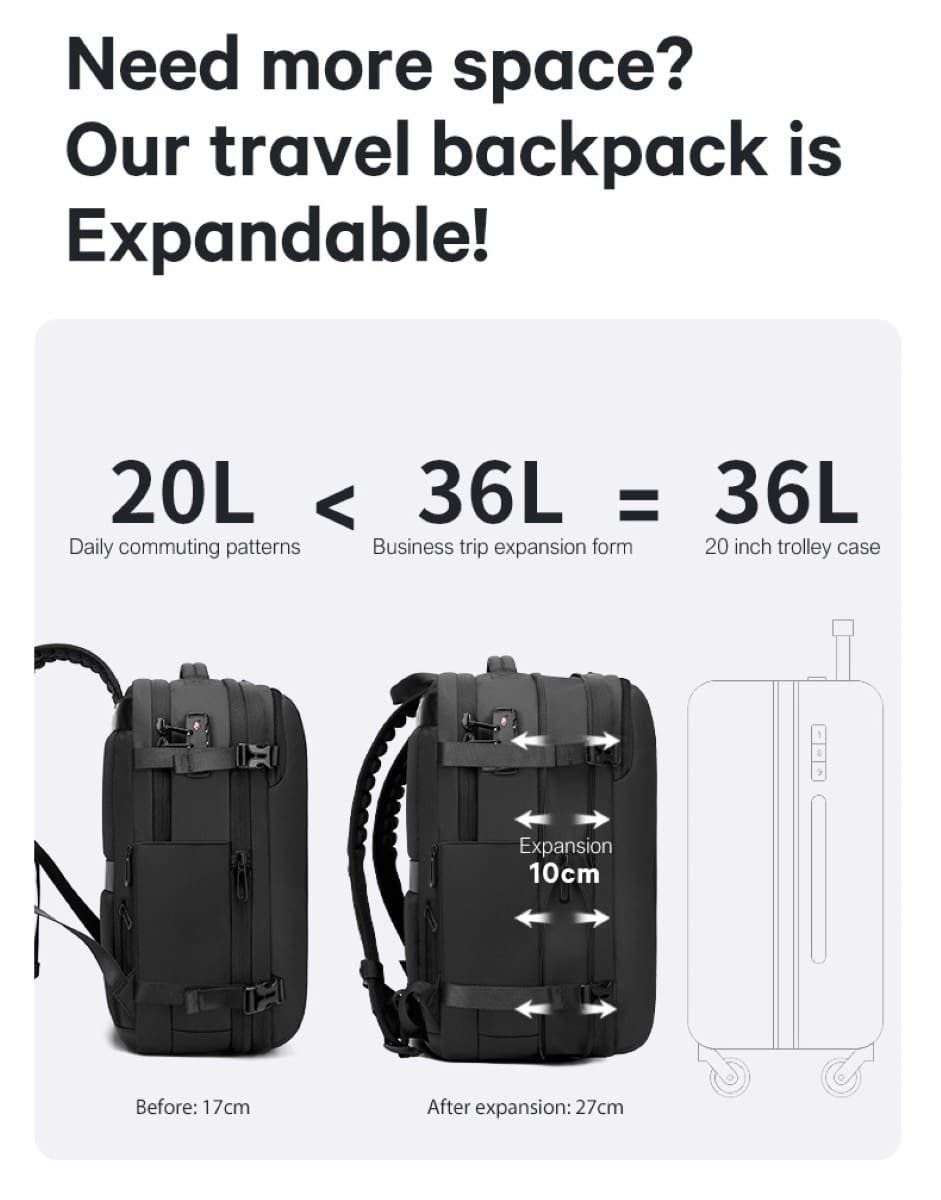 Πριν από την επέκταση, η χωρητικότητα του σακιδίου είναι 20 λίτρα με διαστάσεις 46 x 20 x 30,5 cm. Μετά την επέκταση, φτάνει τα 36 λίτρα, ενώ οι διαστάσεις είναι 46 x 28 x 30,5 cm. Το φερμουάρ και οι πόρπες επεκτείνονται εύκολα, ώστε να προσαρμόζονται ανάλογα με τις ανάγκες σας. Οι ραφές στους ώμους και τις λαβές είναι ενισχυμένες, προσφέροντας αυξημένη αντοχή και μακροχρόνια χρήση.