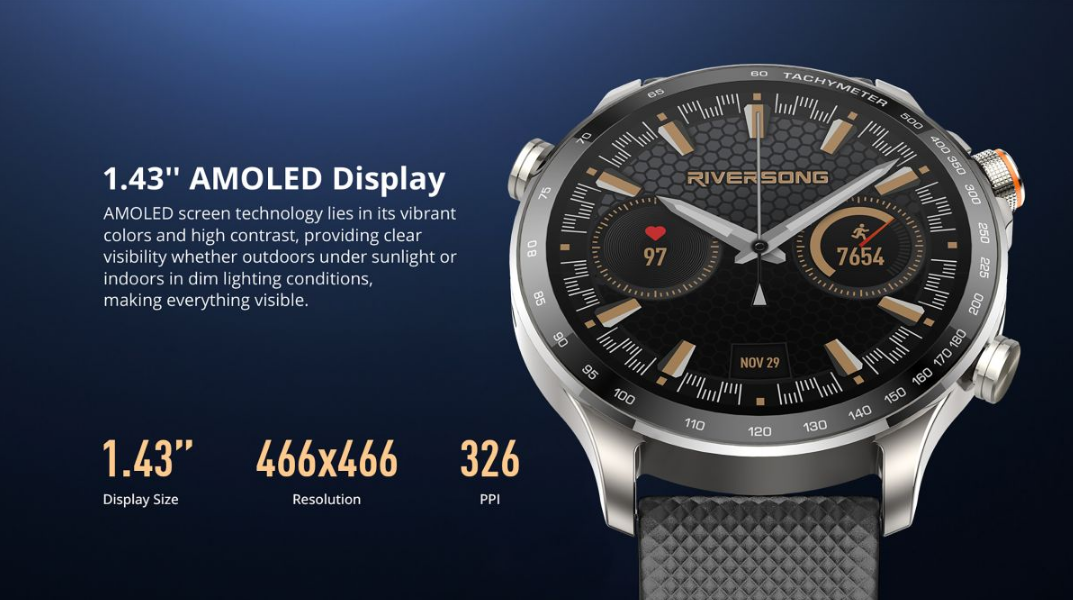 Το Smartwatch Motive 10 GT της Riversong διαθέτει οθόνη AMOLED 1,43", η οποία προσφέρει ζωντανά χρώματα και υψηλή αντίθεση, εξασφαλίζοντας καθαρή ορατότητα, σε κάθε συνθήκη φωτισμού, είτε κάτω από το έντονο φως του ήλιου, είτε σε σκοτεινούς εσωτερικούς χώρους, έτσι κάθε λεπτομέρεια παραμένει ορατή, όπου κι αν βρίσκεστε.
