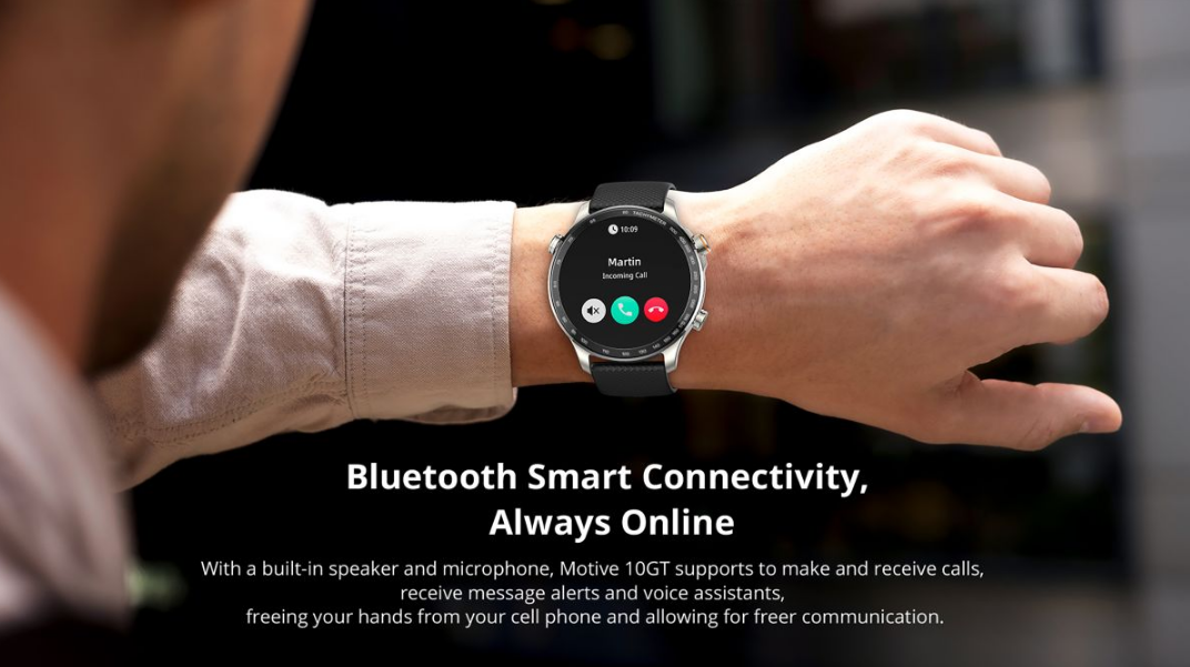 Χάρη στην έξυπνη συνδεσιμότητα μέσω Bluetooth, το ενσωματωμένο ηχείο και το μικρόφωνο, το Motive 10GT σας επιτρέπει να πραγματοποιείτε και να δέχεστε κλήσεις, να λαμβάνετε ειδοποιήσεις μηνυμάτων και να χρησιμοποιείτε φωνητικούς βοηθούς με ευκολία και άνεση.