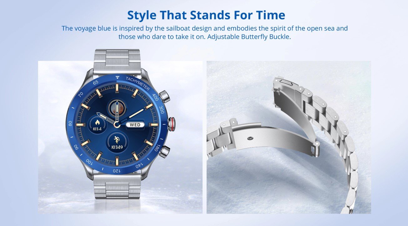 Το Voyage blue είναι εμπνευσμένο από το σχέδιο του ιστιοφόρου και ενσαρκώνει το πνεύμα της ανοιχτής θάλασσας, ενώ διαθέτει προσαρμοζόμενο κούμπωμα. Απάντησε και απόρριψε τις εισερχόμενες κλήσεις, στείλε προσαρμοσμένες γρήγορες απαντήσεις και δες τα αρχεία καταγραφής κλήσεων, για να παραμείνεις συνδεδεμένος ακόμα και όταν βρίσκεσαι εν κινήσει.
