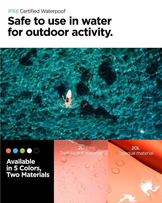 Το A630 Aqua Shield Dry Bag της Spigen είναι ένα απαραίτητο σετ για τις οικογενειακές σας διακοπές και όχι μόνο! Αποτελείται από δύο αδιάβροχους σάκους, 20 λίτρων και 2 λίτρων. Χάρη στον ελαφρύ και αδιάβροχο σχεδιασμό τους, είναι ιδανικά για τα θαλάσσια σπορ, τη πεζοπορία ή το κάμπινγκ!