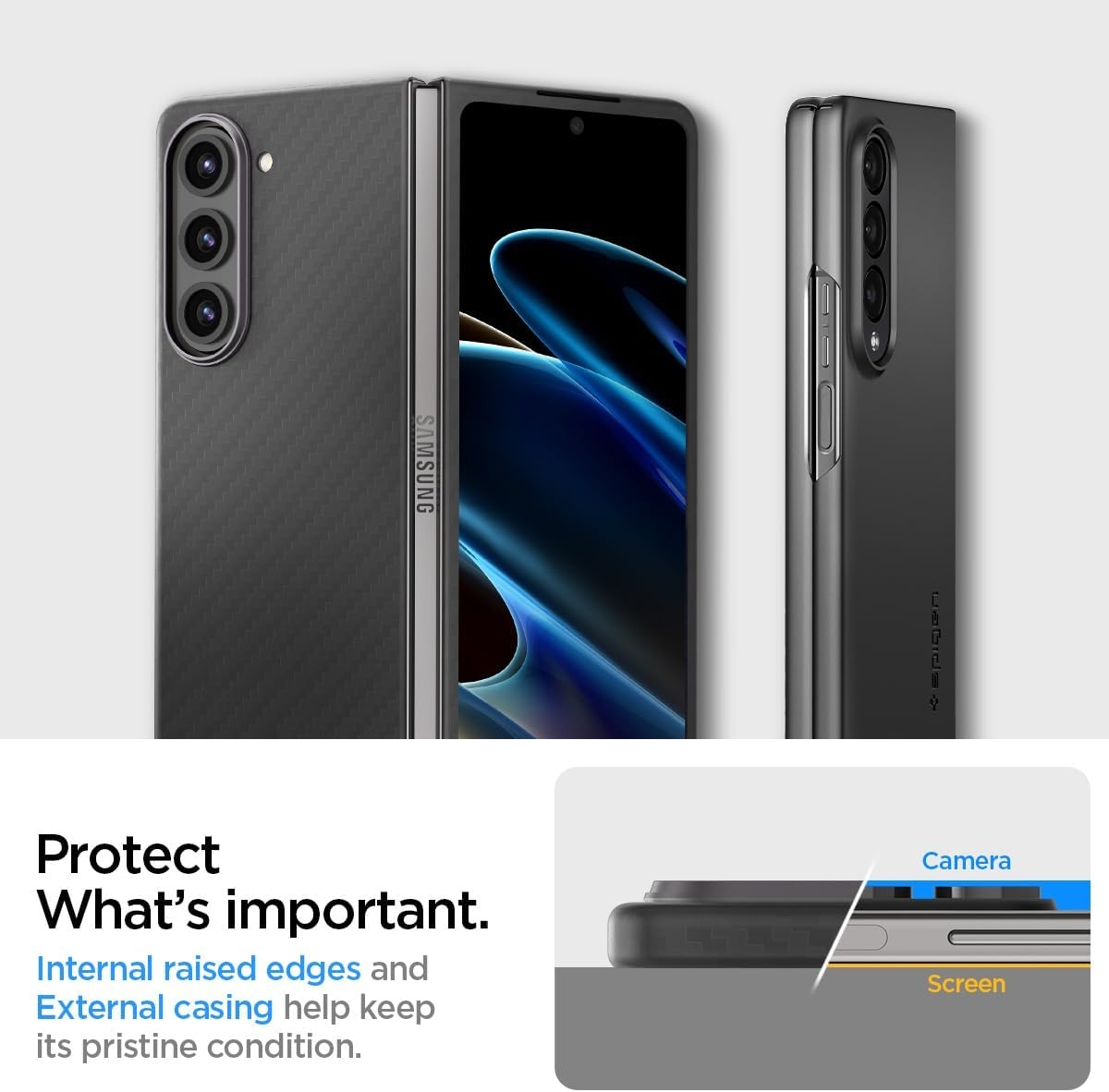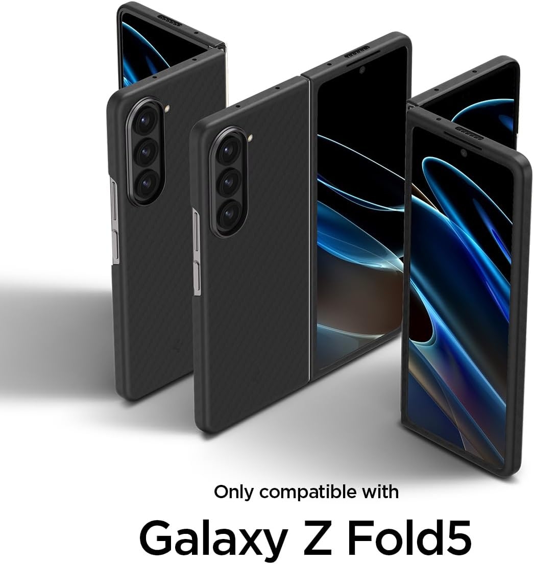 Είναι κατασκευασμένη από υψηλής ποιότητας πολυανθρακικό PC, φινιρισμένο με Premium ίνες αραμιδίου, το οποίο δεν είναι μόνο ελαφρύ, αλλά προσφέρει και εξαιρετική αντοχή. Το πρόσθετο στρώμα διατηρεί τη θήκη καθαρή και ανθεκτική στα δακτυλικά αποτυπώματα, η οποία προστατεύει το Samsung Galaxy Z Fold5 από γρατζουνιές, φθορές, πτώσεις ή χτυπήματα.