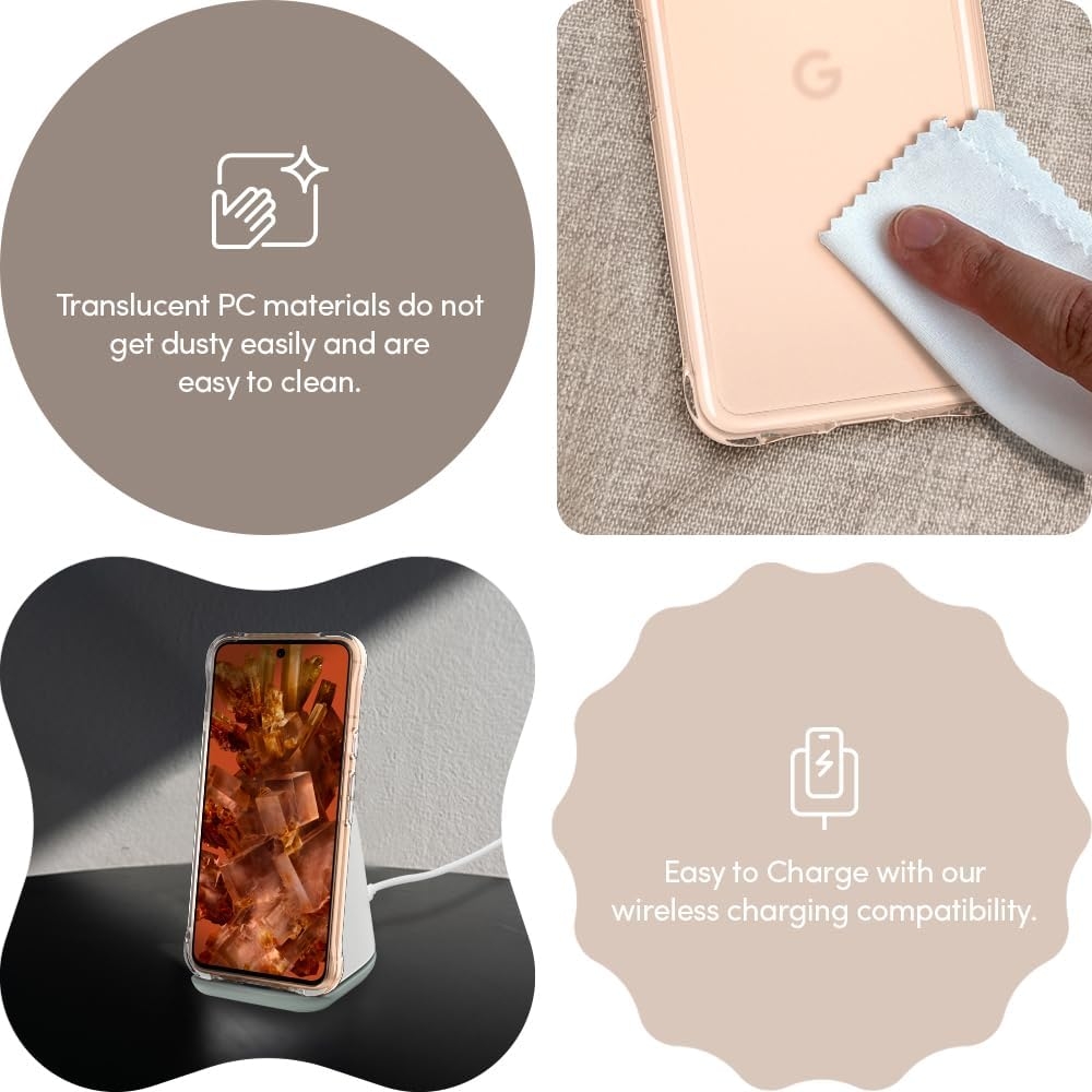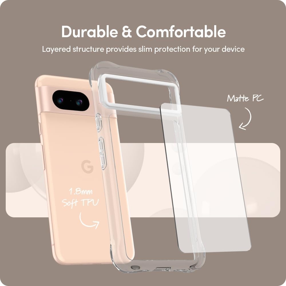 Κατασκευασμένη από ανυψωμένη κατά 1.8mm ματ θερμοπλαστική πολυουρεθάνη TPU περιμετρικά της οθόνης, η οποία απορροφά τους κραδασμούς, ενώ περιμετρικά της κάμερας και στην πλάτη, αποτελείται από σκληρό πολυανθρακτικό πλαστικό PC, προστατεύοντας το Google Pixel 8 από γρατζουνιές, φθορές, πτώσεις ή χτυπήματα.