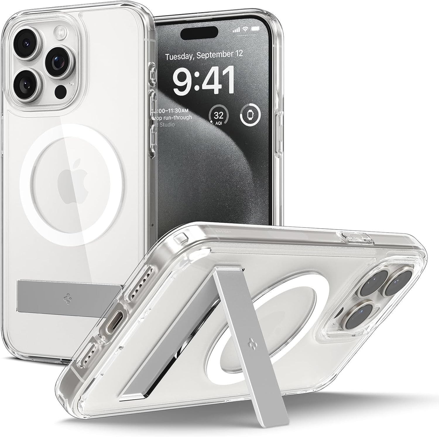 Στο πίσω μέρος ακόμα, διαθέτει ειδικό stand για να μπορείτε να τοποθετείτε το κινητό σας οριζόντια, ώστε να βλέπετε σειρές ταινίες ή ότι άλλο επιθυμείτε. Έχει αυξημένο χείλος περιμετρικά έτσι ώστε να προστατευτεί το κινητό σας σε μία πτώση με την μπροστινή όψη στο έδαφος. Διαθέτει μαγνητικό δακτύλιο, συμβατό με τον ασύρματο φορτιστή MagSafe, για γρήγορη και εύκολη φόρτιση.