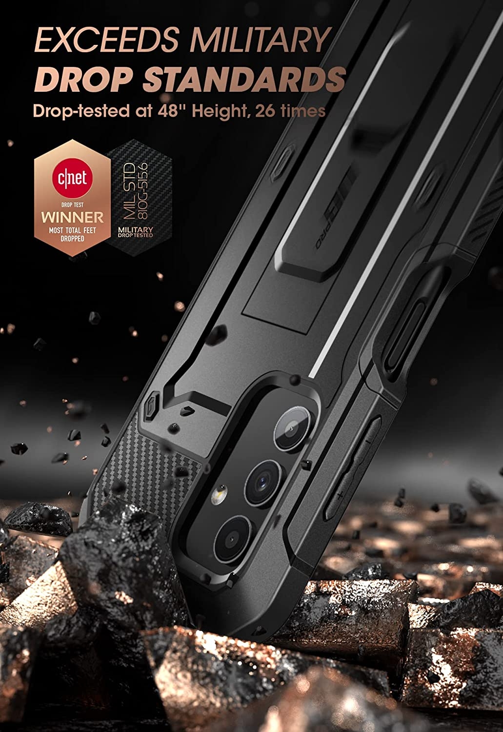 Στη πίσω όψη της ακόμη, περιλαμβάνει μια στρώση από πιο ενισχυμένο TPU. Είναι μια θήκη, η οποία έχει περάσει από 26 ειδικούς ελέγχους, έχοντας εξασφαλίσει τη πιστοποίηση στρατιωτικών προδιαγραφών ΜΙL-STD810G-516.6. Πρακτικά αυτό σημαίνει ότι είναι ιδανική ενάντια στις πτώσεις, καθώς έχει πέσει από ύψος 1.20 m χωρίς να πάθει απολύτως τίποτα.