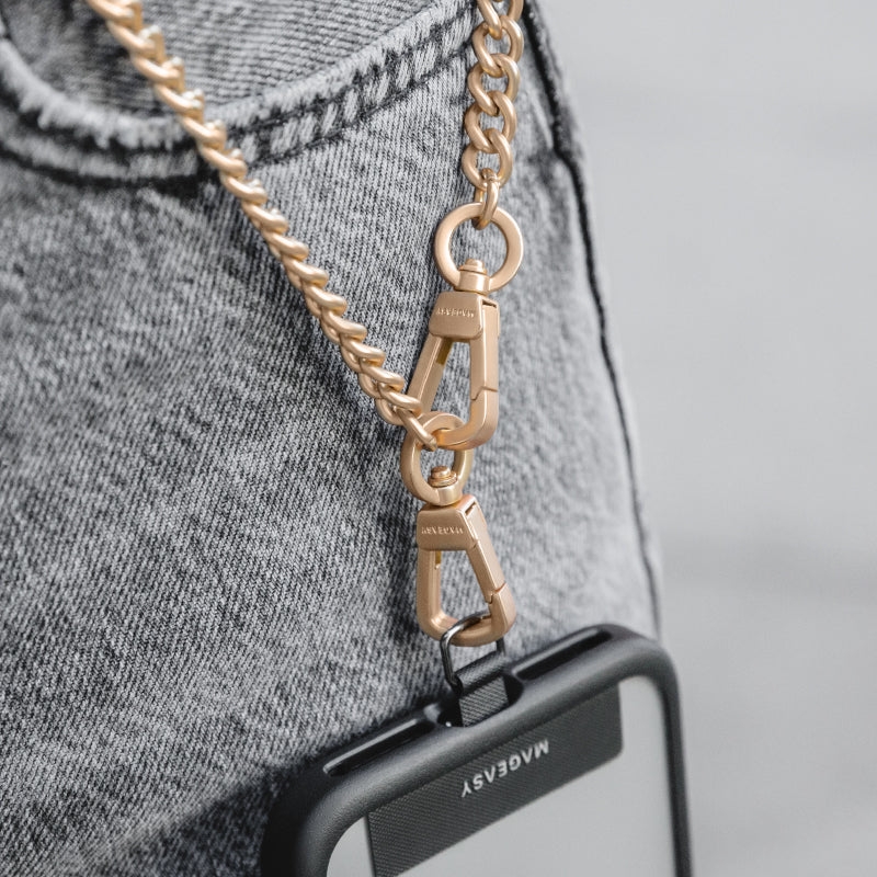 Το μοντέρνο και υποαλλεργικό, ανθεκτικό λουράκι συνδυάζει την εκλεπτυσμένη μεταλλική αλυσίδα με τον προσεγμένο σχεδιασμό και είναι επεξεργασμένο με ματ ηλεκτρολυτική επίστρωση για αντοχή και στυλ. Αν φοράτε παντελόνι χωρίς τσέπες ή δεν θέλετε να έχετε την τσάντα σας, αυτό το λουράκι είναι η ιδανική λύση. Κρατήστε το τηλέφωνό κοντά σας, χωρίς να χρειάζεται να ψάχνετε στην τσάντα σας.
