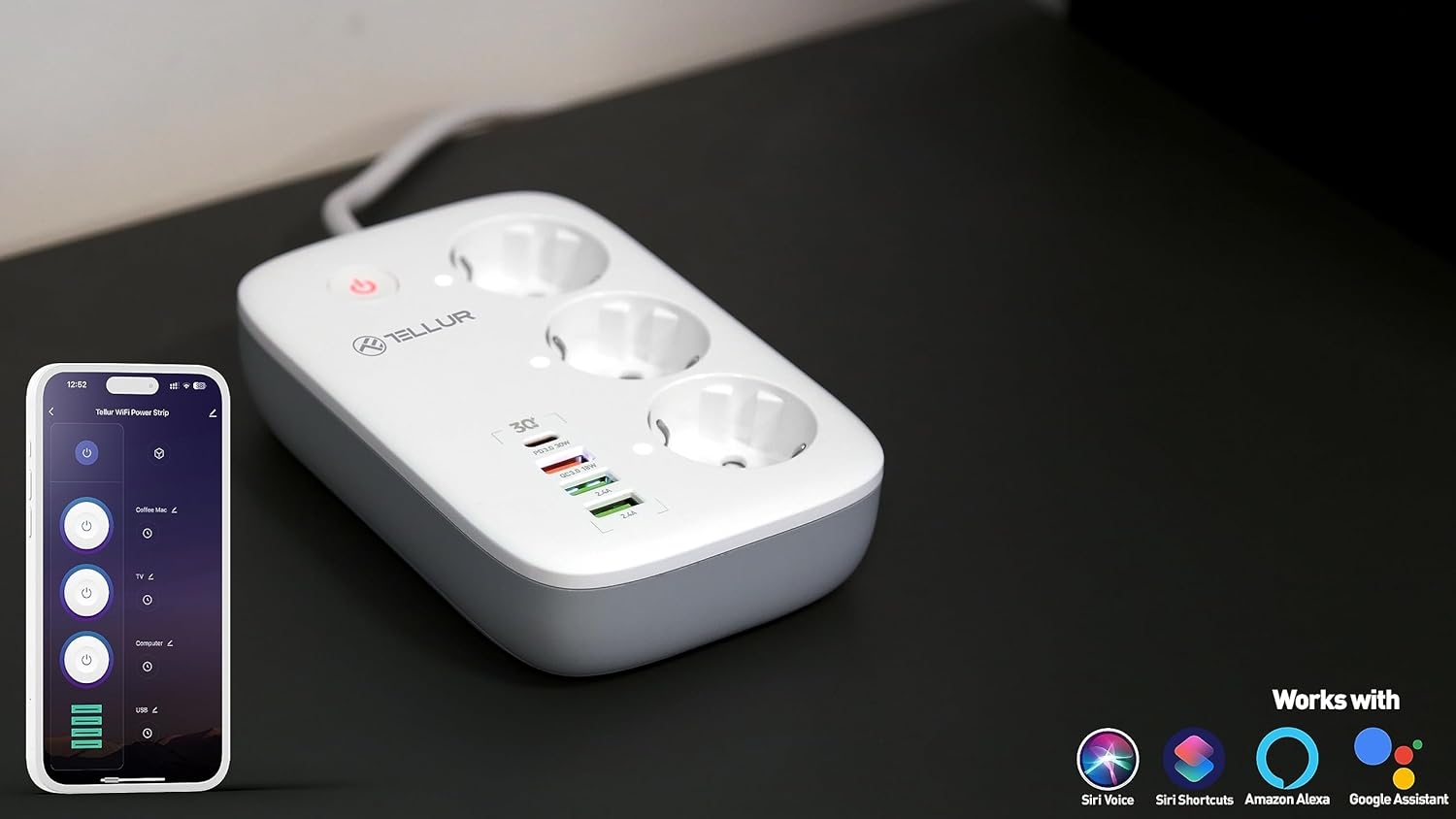 Με 3 πρίζες Schuko και δυνατότητες ατομικού ελέγχου, αυτό το πολύπριζο σας δίνει πλήρη έλεγχο του τροφοδοτικού σας. Το έξυπνο πολύπριζο Wi-Fi ενσωματώνεται άψογα με το οικοσύστημα Tellur, καθιστώντας το μια εξαιρετική προσθήκη στη ρύθμιση του έξυπνου σπιτιού σας. Είναι επίσης συμβατό με Siri, Google και Amazon Alexa, ώστε να μπορείτε να ελέγχετε την τροφοδοσία σας μόνο με τη φωνή σας. Και επειδή δεν απαιτείται διανομέας, η σύνδεση με την εφαρμογή Tellur Smart, η οποία μπορεί να ληφθεί από το Google Play και το App Store, είναι γρήγορη και εύκολη.