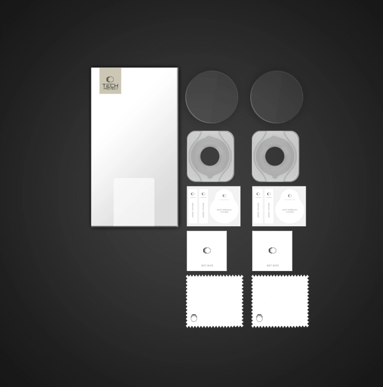 Η συσκευασία περιλαμβάνει: 2 x Tempered Glass Easy Set+ με οδηγούς εγκατάστασης, 2 x Στεγνά πανάκια, 2 x Υγρά πανάκια, 2 x Αυτοκόλλητα για τη σκόνη.