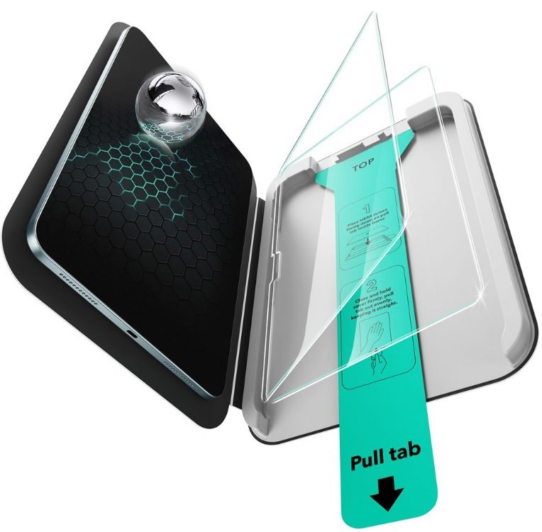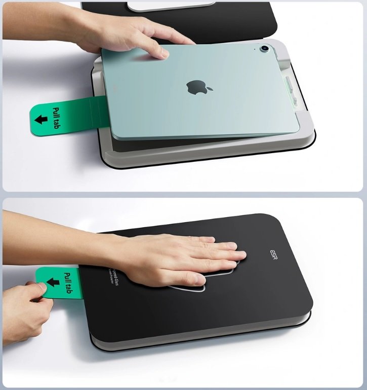 Σας εξασφαλίζει μία ομοιόμορφη και αποτελεσματική εφαρμογή, με ευθυγράμμιση σε τέσσερις γωνίες για σταθερό και ασφαλές αποτέλεσμα, μειώνοντας την ακούσια κίνηση. Η λωρίδα απομάκρυνσης φυσαλίδων αέρα εξασφαλίζει τη γρήγορη απομάκρυνση του αέρα και μειώνει τις ατέλειες κατά την εφαρμογή. Η ταινία τραβήγματος, αφαιρεί τη σκόνη για εύκολη εφαρμογή, ενώ ο δίσκος εξασφαλίζει την ακριβή ευθυγράμμιση.